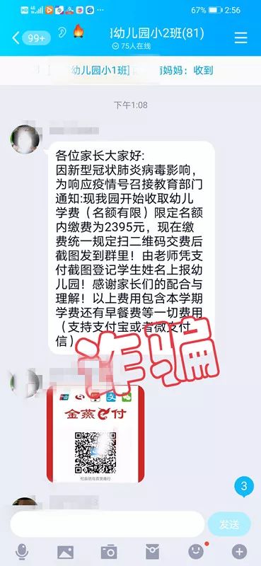2月6日中午1点多,江苏省如皋市白蒲镇某幼儿园小2班的家长们在班级QQ群中收到了“陈老师”发布的一则收费通知:“因为疫情影响,接教育部门通知,现开始收取幼儿园学费,统一扫二维码付款后截图发群里!”
