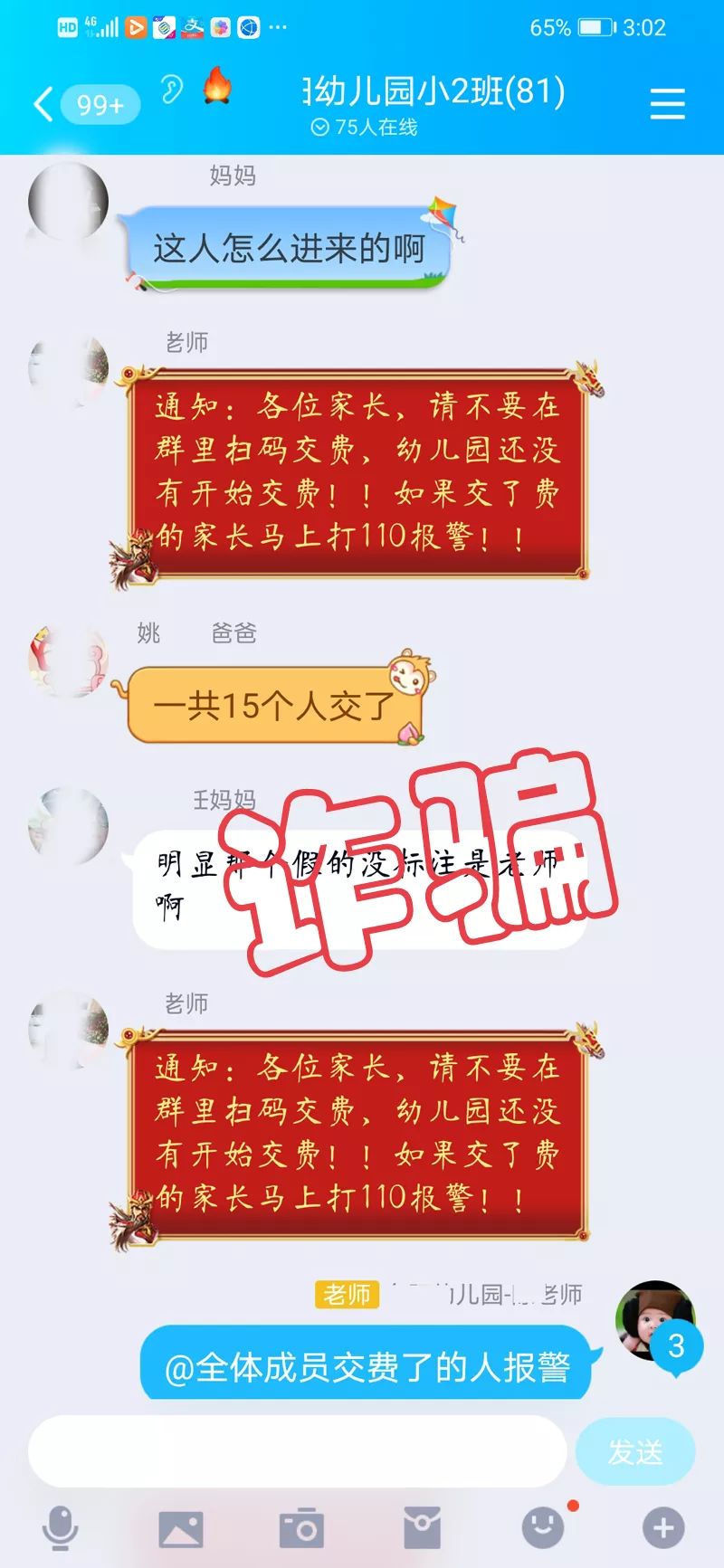 可是没多久,群里突然出现另一名陈老师,她紧急告诉大家停止缴费,自己才是真的老师,幼儿园没有要求缴费,刚才发布信息的是骗子。