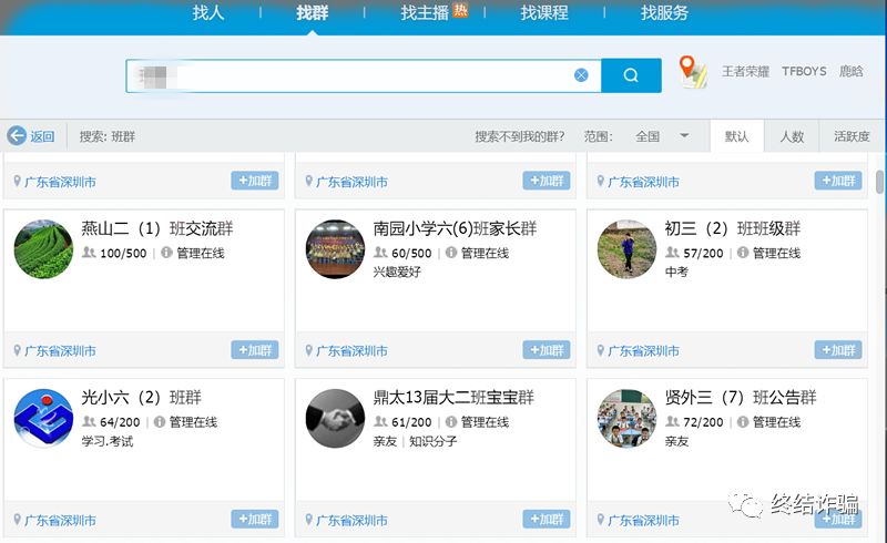 诈骗分子会直接在QQ内 搜索班级群的群聊关键字 即可出现大量公开的群聊信息