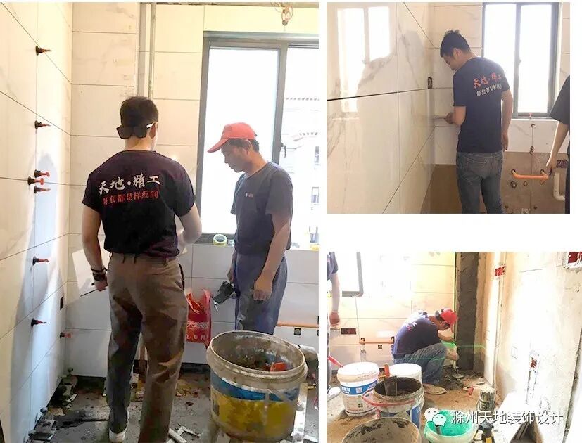 装修过程中,瓦工是非常重要的环节,更考验师傅的手艺和技术,水平仪能够帮助到瓷砖铺设更加完整可靠, 在施工的时候就能够更加精准。周总现场指导师傅贴砖时候该注意的细节,项目总监现场用阴阳角尺测量阴阳角的标准。