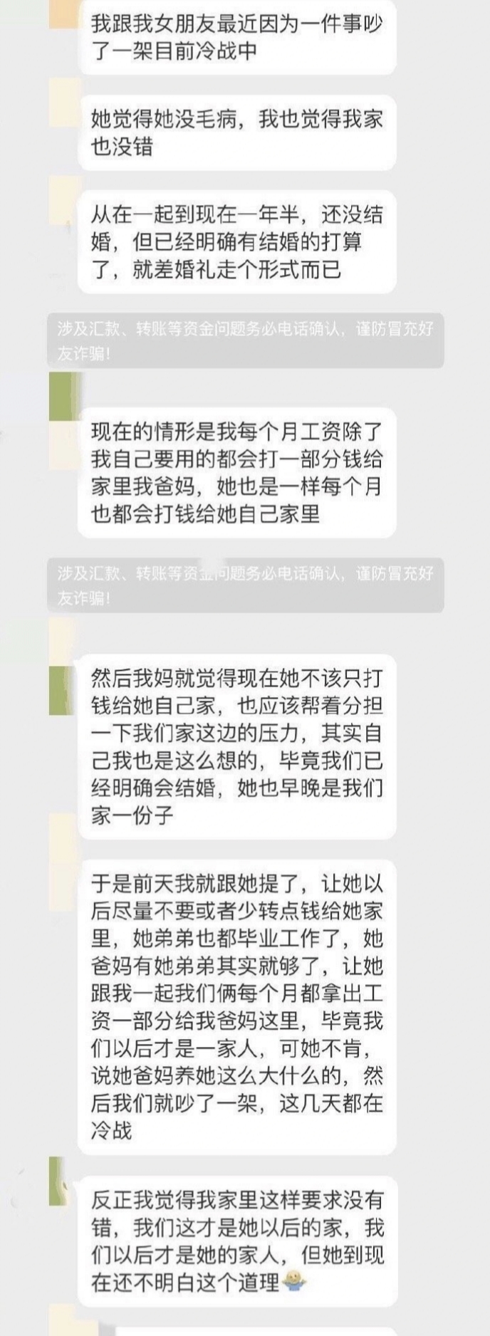 看微博没把自己气死,没结婚就要女的打钱给他爸妈用,还不允许女的打钱给她自己爸妈用,还义正言辞的说什么以后他们一家人,还没结婚她就应该帮忙分摊压力,恶心死我了