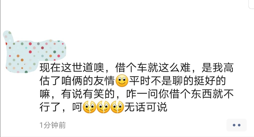 昨天朋友问我借车,说想五一出去玩借用一下,我因为自己也有事情就拒绝了,结果结果,昨晚睡觉之前刷朋友圈,看到她发的说什么觉得高估自己的地位了,借个东西这么难,我发现都没人点赞,有点怀疑她是不是设置仅我可见了,真是无语,就这么点小事