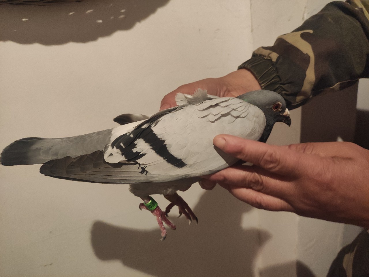 晚上9点多,这只编号0247695的鸽子一头扎进小哥家窗户上,脚上有二维码,但是怎么也扫不出来也不飞走,不知道是不是今晚变天起风迷路了,刚刚把它安顿在家里杂物间,正好有个大盒子里面铺的草,很乖很安静的窝在里面,杂物间没有门,希望明天白天它能起飞找到回家的路!