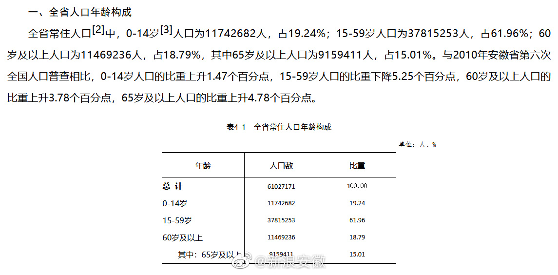 根据安徽省第七次全国人口普查结果显示:与2010年安徽省第六次全国人口普查相比,0-14岁人口的比重上升1.47个百分点,15-59岁人口的比重下降5.25个百分点,60岁及以上人口的比重上升3.78个百分点,65岁及以上人口的比重上升4.78个百分点。(安徽省统计局)