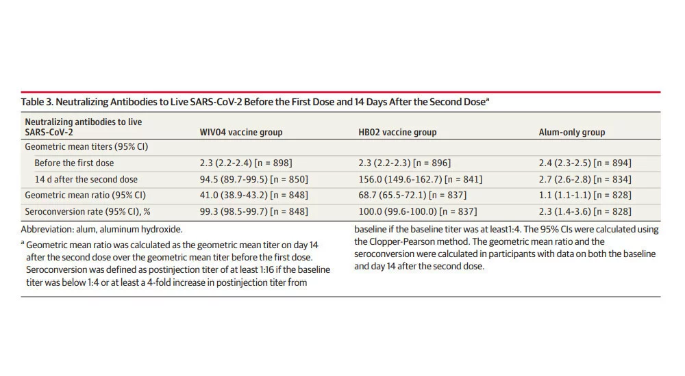 在收集的病例中,仅铝佐剂组出现2例重症病例,而两个疫苗组均未出现重症病例,因此疫苗组对新冠肺炎重症的保护效力为100%。然而,鉴于重症病例的数量较少,结果还有待进一步收集。整个随访期间未出现死亡病例。 在免疫原性研究中,基线时中和抗体几何平均滴度(GMTs)在两个疫苗组均为2.3,铝佐剂组为2.4,第二剂接种14天的GMTs在WIV04组中为94.5(95%CI,89.7-99.5),在HB02组中为156.0(95%CI,149.6-162.7),铝佐剂组为2.7(95%CI,2.6-2.8)。WIV04组、HB02组和铝佐剂组的血清阳转率(4倍增长)分别为99.3%、100.0%和2.3%。