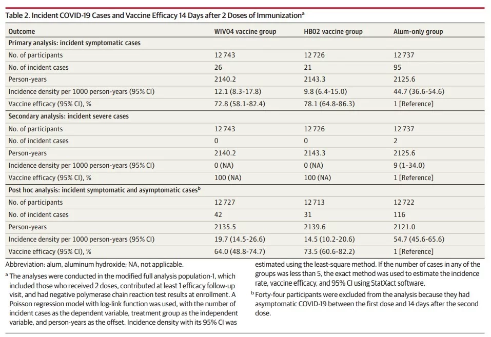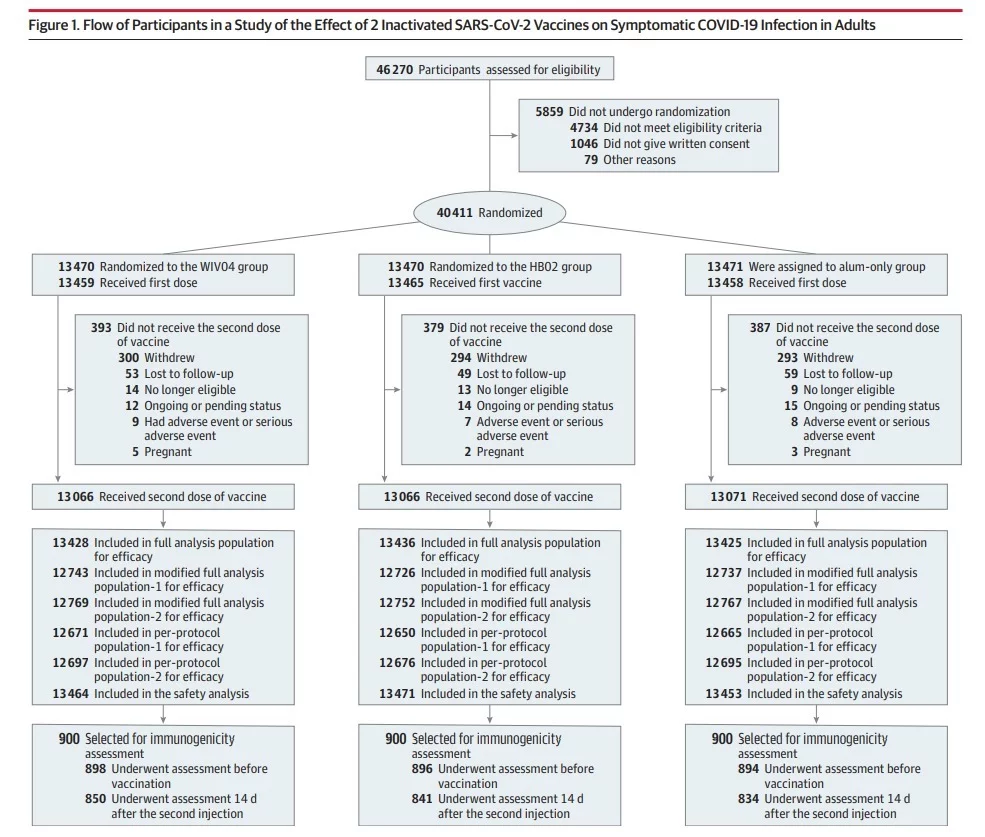 本项研究结果针对中国生物两款新冠灭活疫苗随机、双盲、安慰剂对照的Ⅲ期临床试验开展的中期分析。自2020年7月16日起,40411名受试者入组并随机分为三组,分别为铝佐剂组、新冠疫苗WIV04组和新冠疫苗HB02组。受试者在第0天和第21天接受两次肌肉注射。自第二剂接种后14天,累计确诊142例有效病例(铝佐剂组95例,WIV04组26例,HB02组21例),两种疫苗组有效率分别为72.8%和78.1%(均P