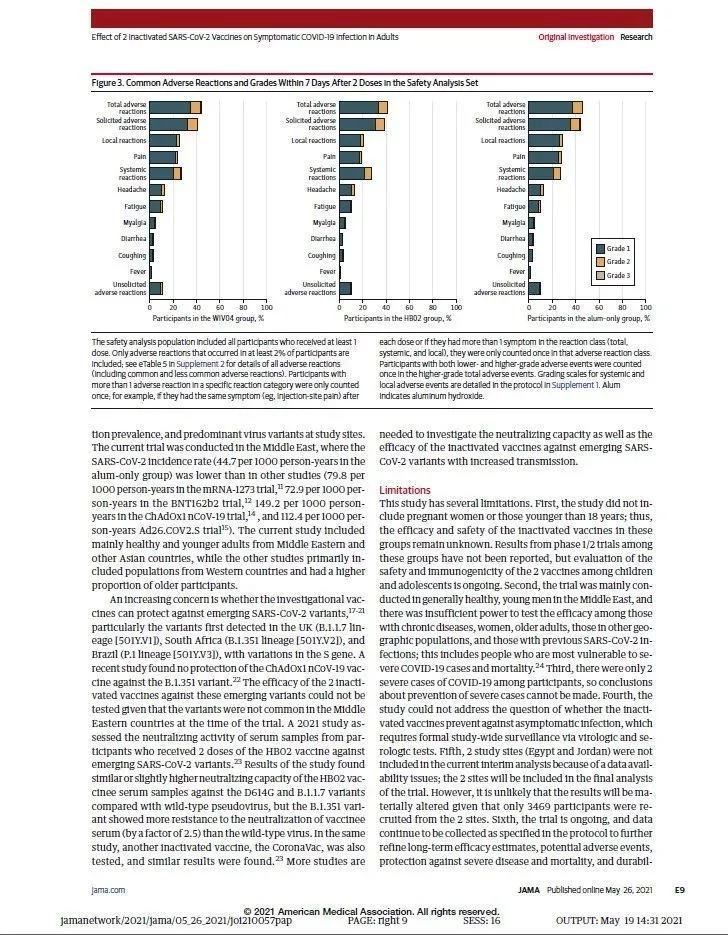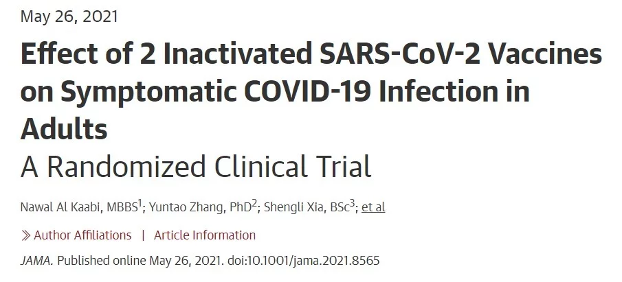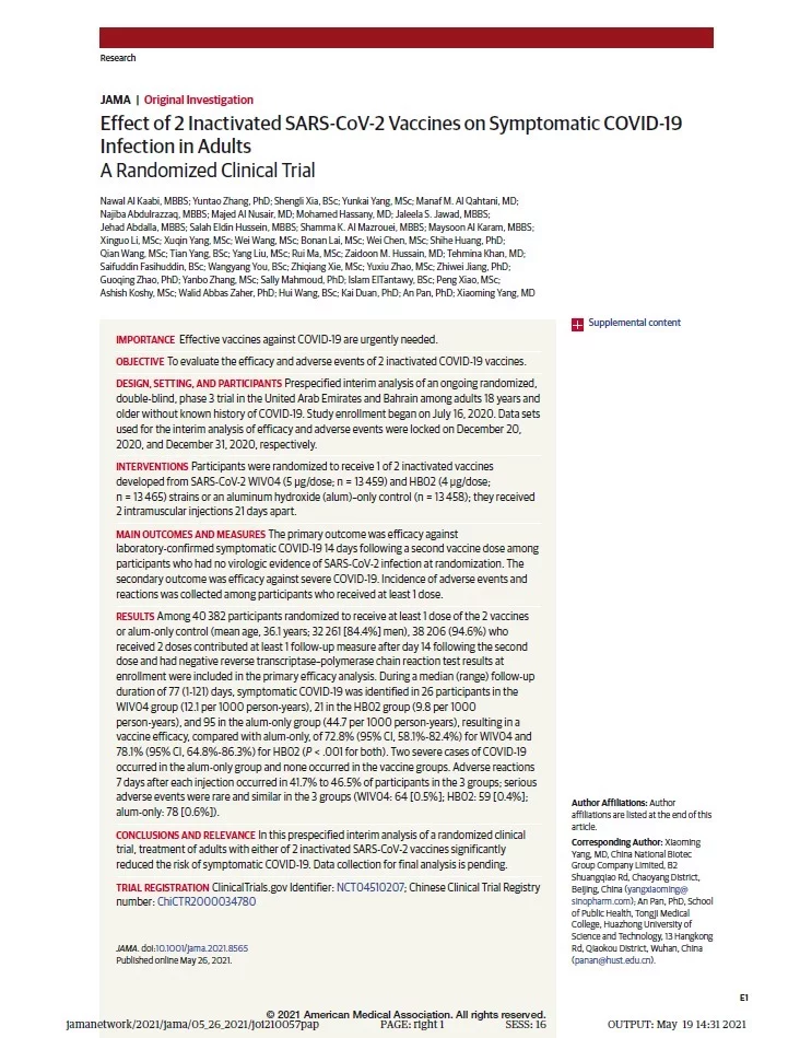 5月26日,国际医学期刊《美国医学会杂志》(The Journal of the American Medical Association, JAMA)刊登了国药集团中国生物发表的《两种新型冠状病毒灭活疫苗对成人COVID-19感染的保护效力评价》(“ Effect of 2 Inactivated SARS-CoV-2 Vaccines on Symptomatic COVID-19 Infection in Adults”)。报告依据中国生物新冠灭活疫苗Ⅲ期临床试验结果,总结分析了中国生物所属北京生物制品研究所(BIBP)、武汉生物制品研究所(WIBP)新冠灭活疫苗的有效性、安全性等Ⅲ期临床试验结果。