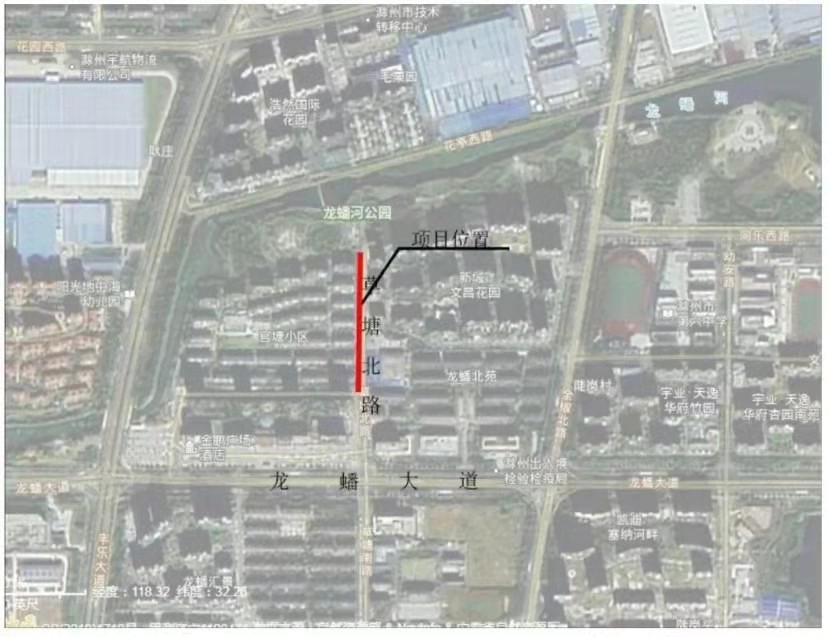草塘北路便民疏导点位于龙蟠大道北侧,草塘路西侧。建设单位为滁州市南谯区龙蟠街道办事处。主要建设内容为铺面及管理用房、消防站、垃圾分类收集等辅助用房。疏导点分为A段和B段,A段建筑轴线尺寸为长86米*宽4.5米*高3.65米,B段建筑轴线尺寸为长137.6米*宽3米*高3.65米。总建筑面积约820平方米。