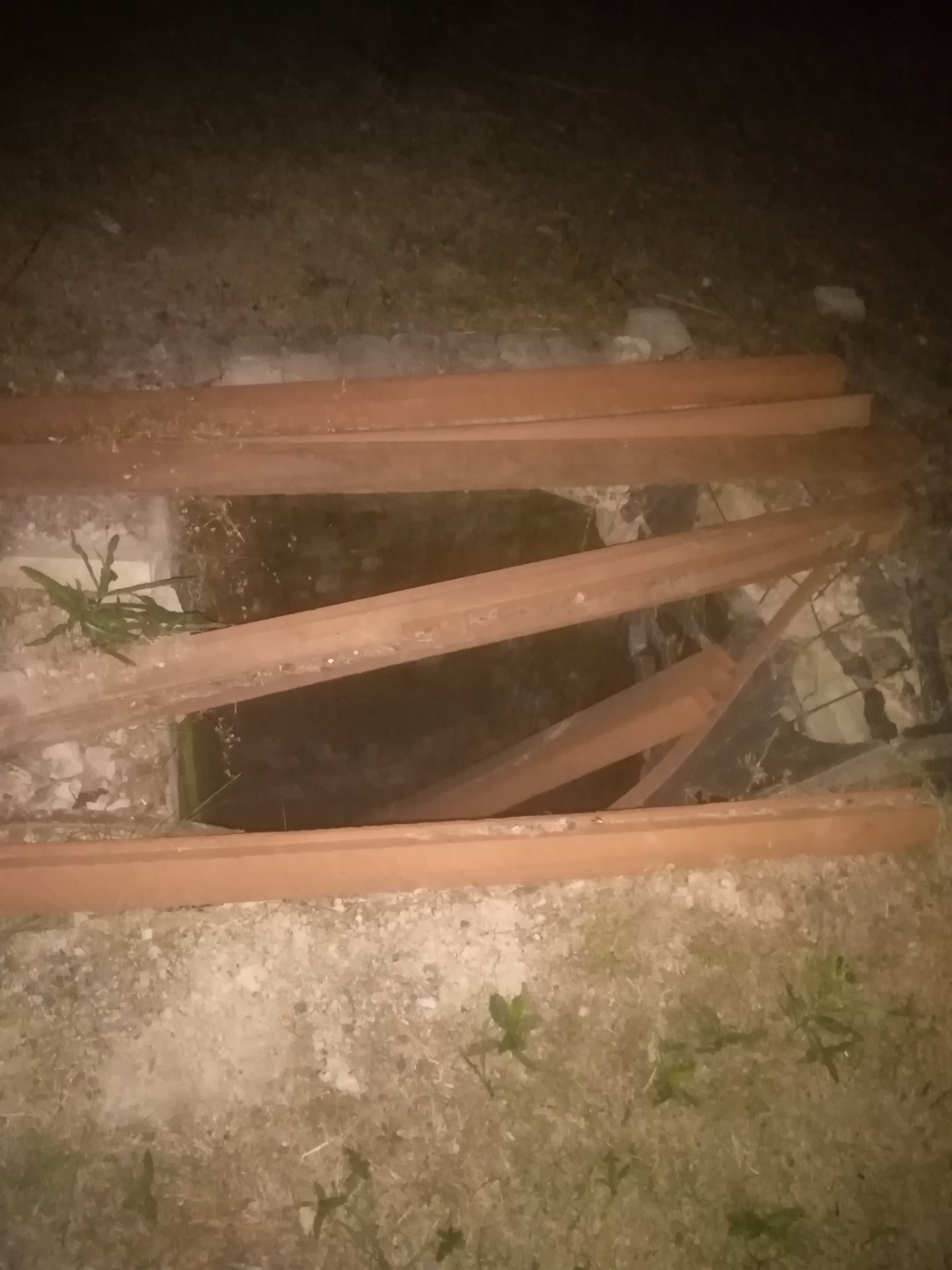 窨井里传来猫叫声,有只猫掉下去了,正好窨井上有几根木条,放一根靠在井沿,希望这只猫在夜深人静时能爬上来。