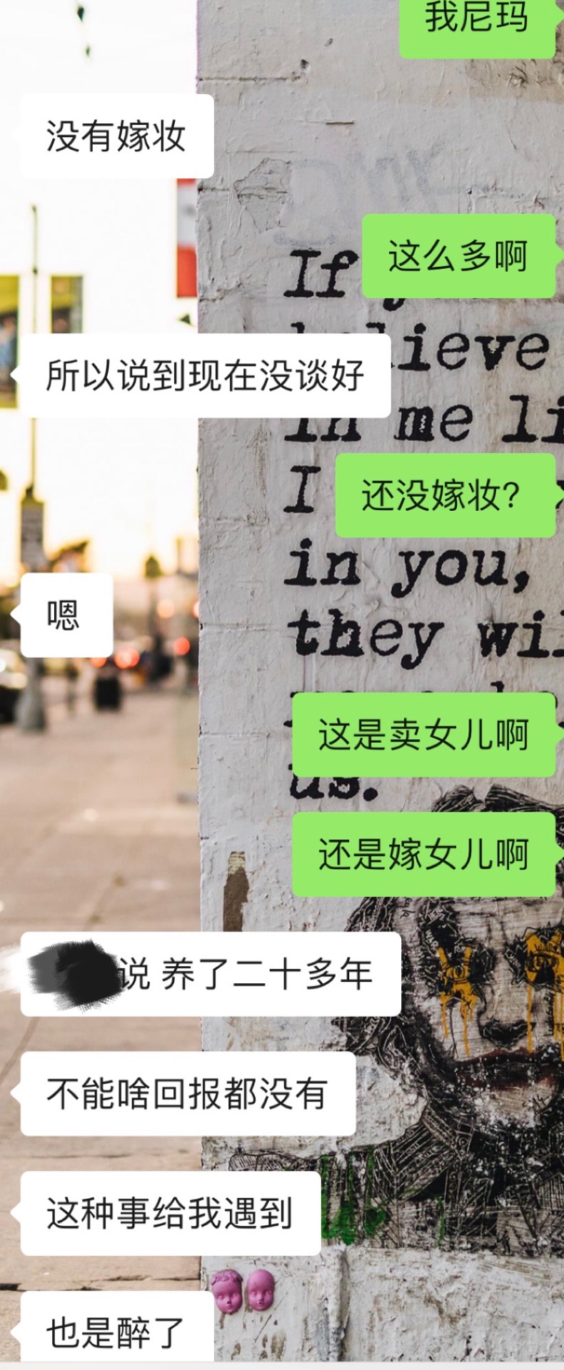 真是电视剧剧情 朋友找了个外地姑娘,就不说是哪里了不是城市的,谈婚论嫁了去她家谈,没想到对方直接说要养育回报,直接要十几万彩礼,真的可怕诶 关键还不带嫁妆,没想到真有这样的家庭。