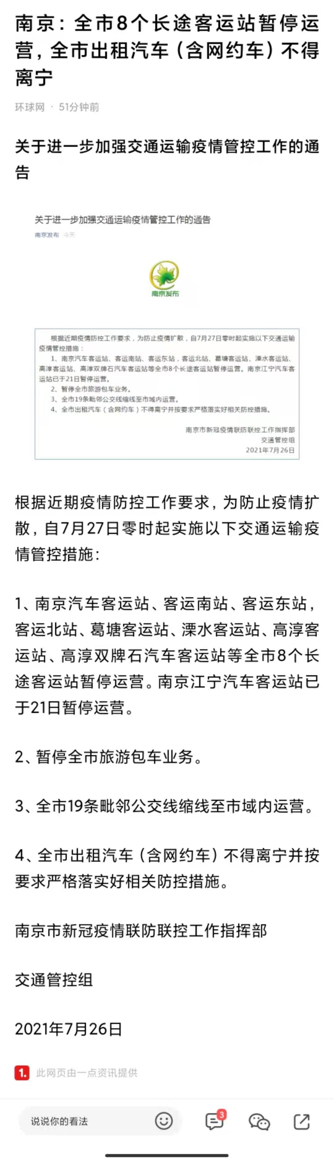 1、南京汽车客运站、客运南站、客运东站,客运北站、葛塘客运站、溧水客运站、高淳客运站、高淳双牌石汽车客运站等全市8个长途客运站暂停运营。南京江宁汽车客运站已于21日暂停运营。