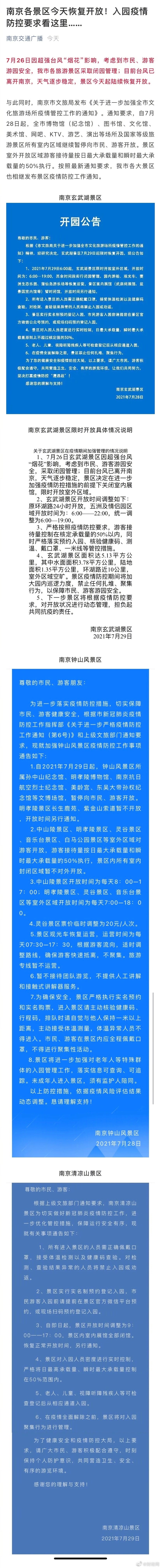通知要求,自7月28日起,全市博物馆(纪念馆)、图书馆、文化馆、美术馆、网吧、KTV、游艺、演出等场所及国家等级旅游景区所有室内区域继续暂停向市民、游客开放。景区室外开放区域游客接待量按日最大承载量和瞬时最大承载量的50%执行。按照最新通知要求,南京市各大景区也相继发布景区疫情防控工作通知。
