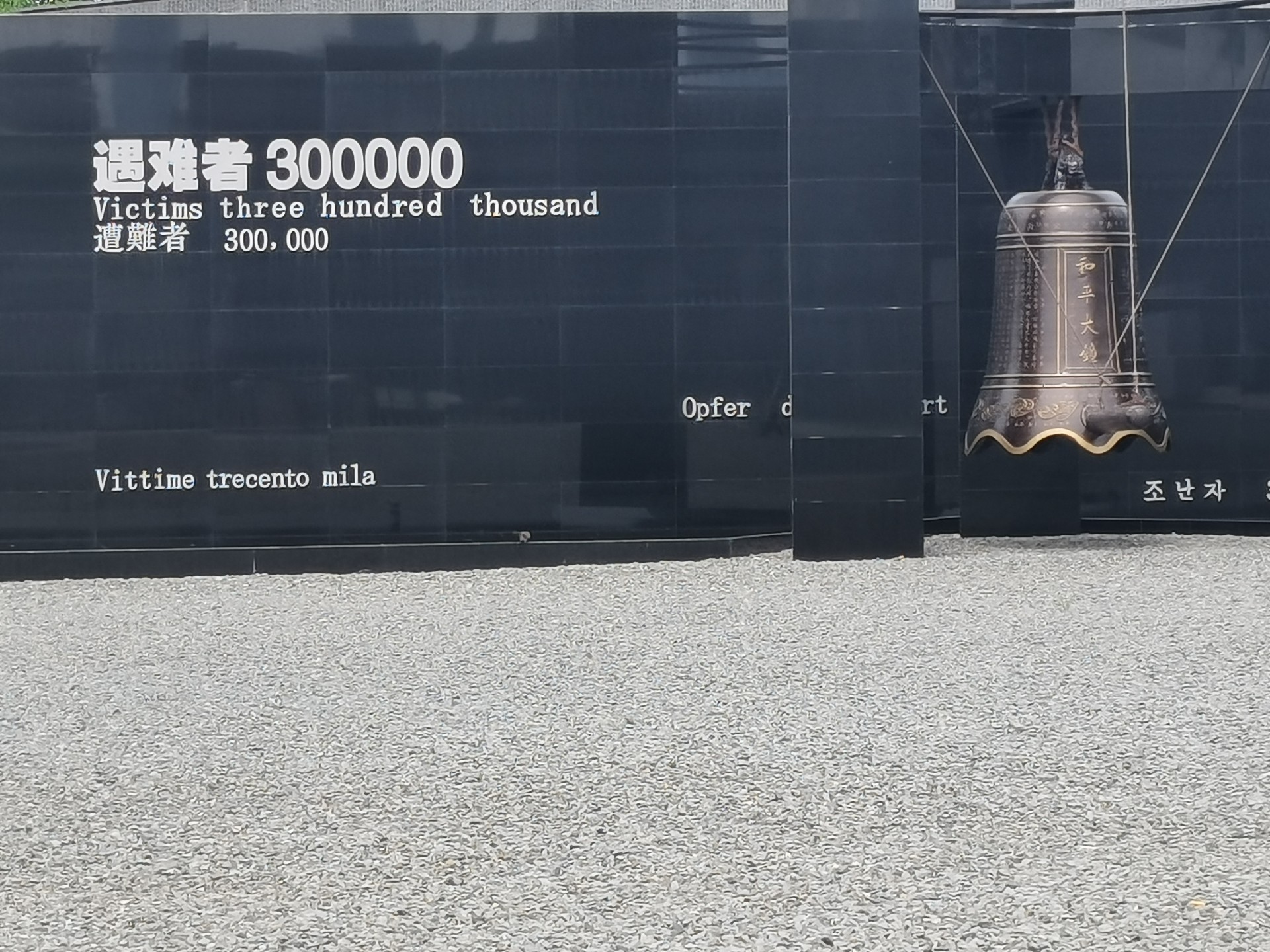 图为南京大屠杀纪念馆门前悬挂的和平钟及遇难者的人数。中国青年网通讯员 王威 摄