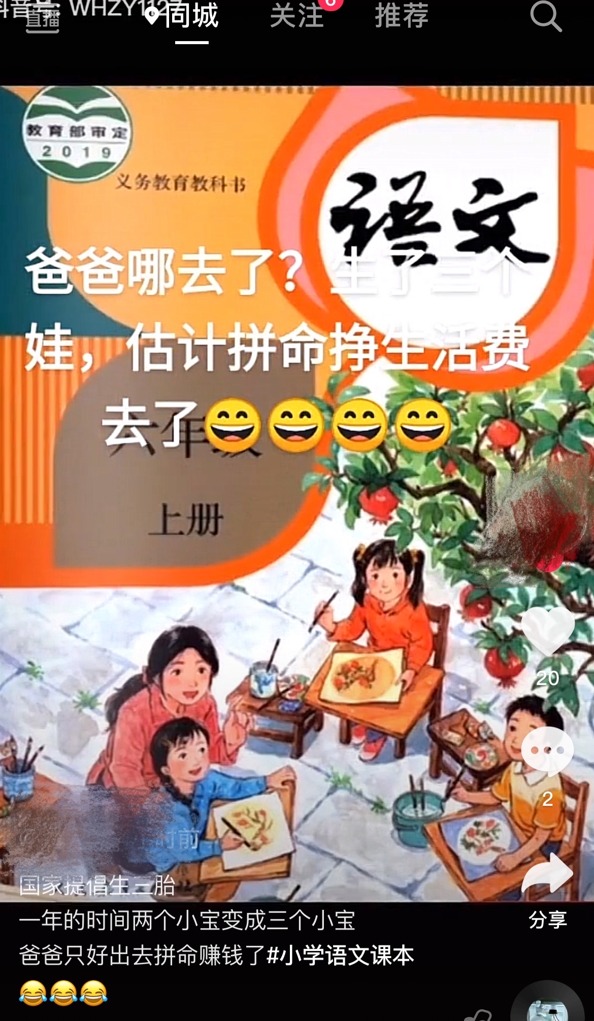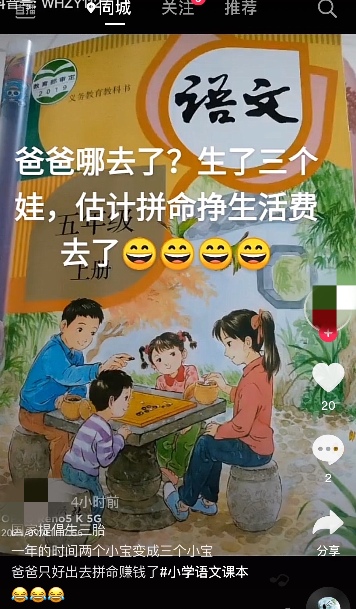 提倡生三胎,小学语文课本封面,两个宝宝变成了三个宝宝,爸爸出去挣钱了,就很现实