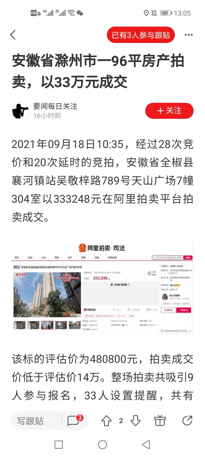 [其它] 滁州全椒一96平房产拍卖,以33万成交!这什么情况,是预示房价要大跌吗? |