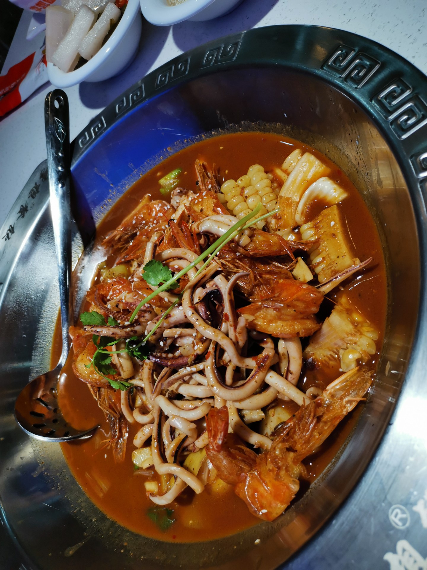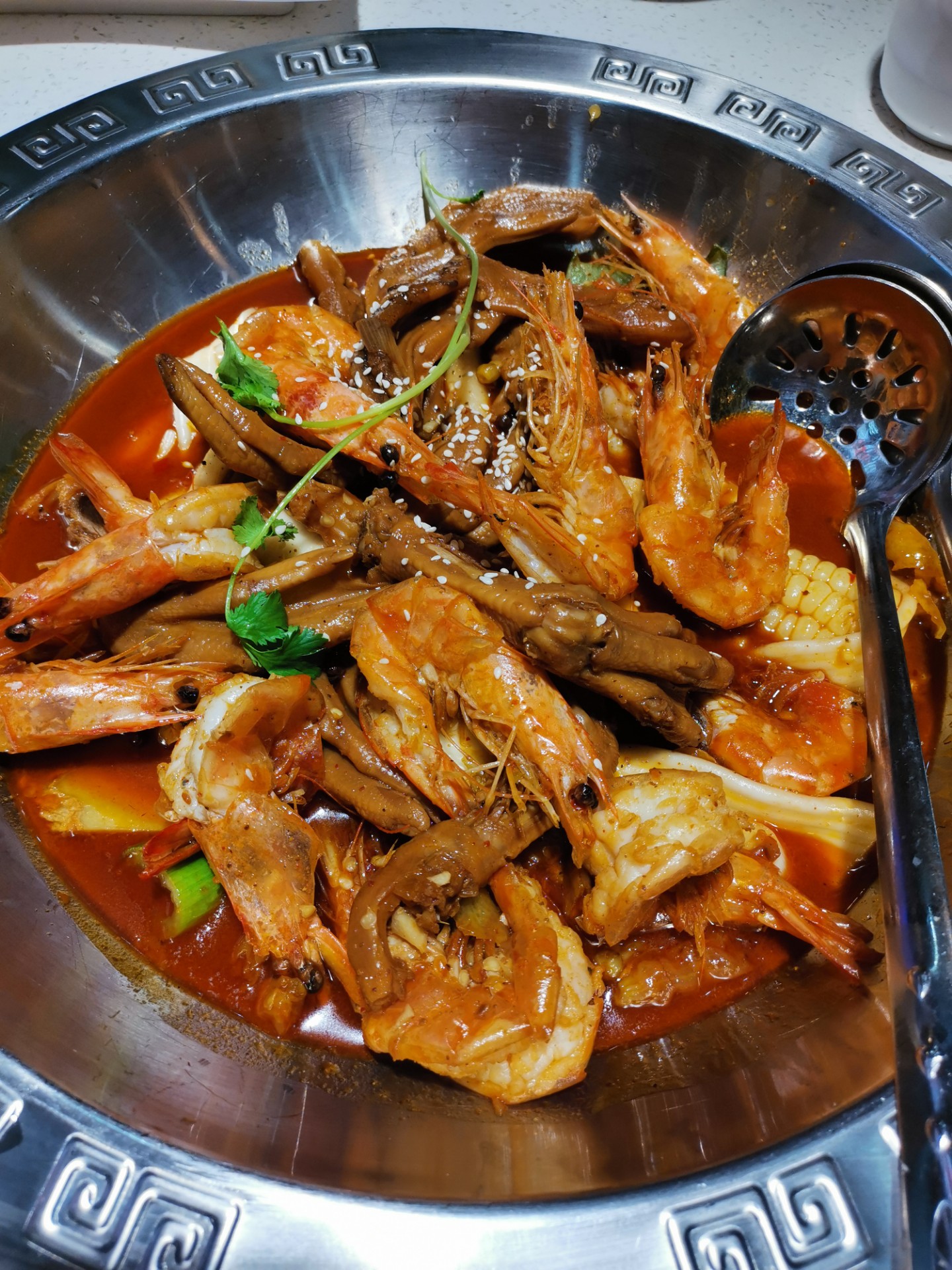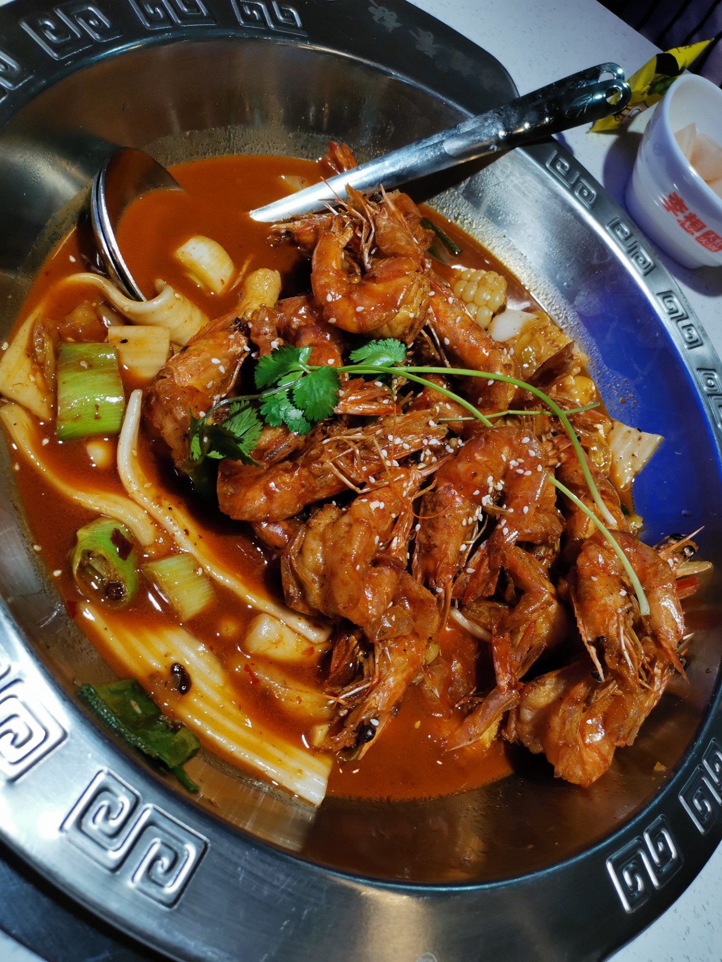 这个虾是先开背炸,然后再放入锅里做的,很入味,而且有许多其他配菜:玉米,宽粉条,年糕……