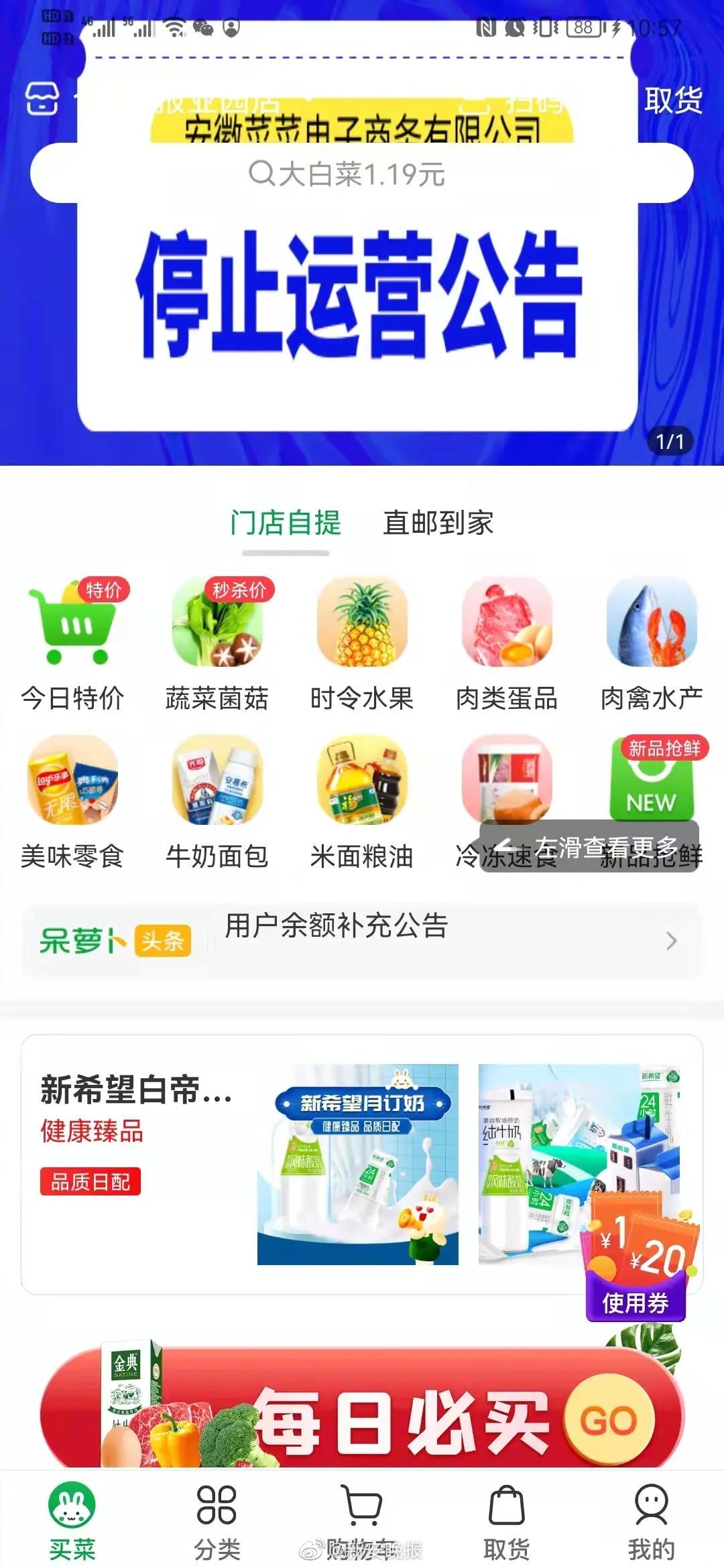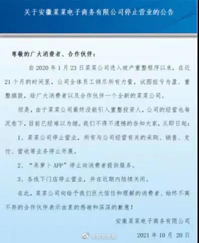 10月20日,在“呆萝卜”APP首页,安徽菜菜电子商务有限公司发布了《关于安徽菜菜电子商务有限公司停止营业的公告》,其中提到,由于菜菜公司最终没能引入重整投资人,即日起停止营业。“呆萝卜APP”停止向消费者提供服务,各线下门店停止营业,并在近期内陆续关闭。公告全文如下: