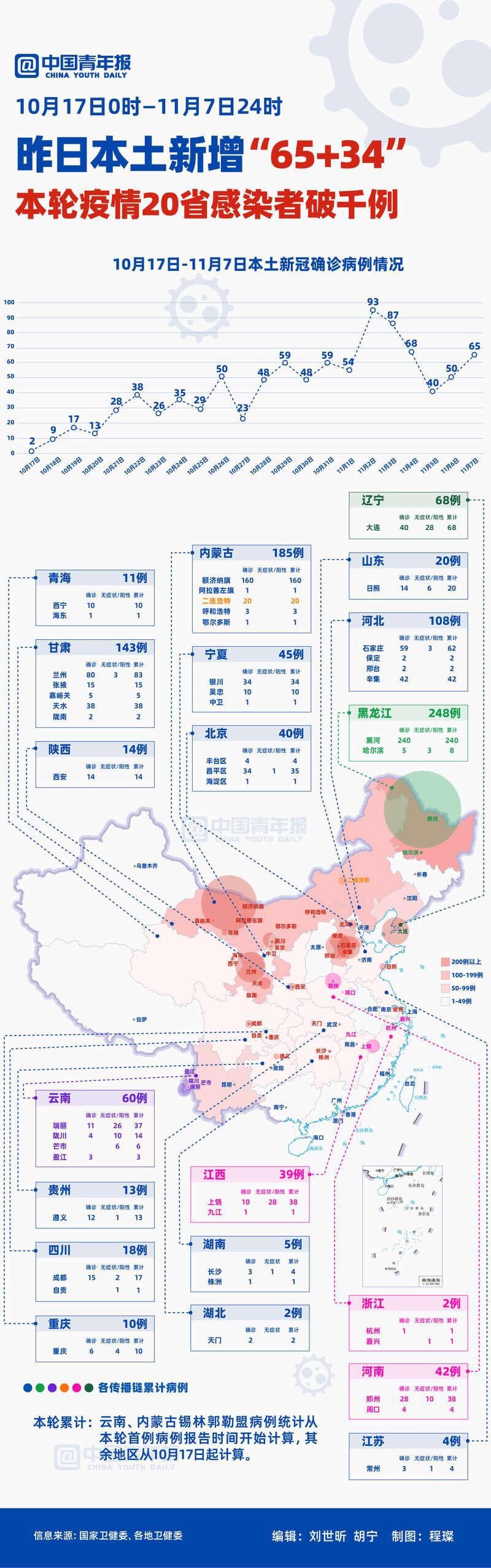 11月7日0—24时,31个省(自治区、直辖市)和新疆生产建设兵团报告新增本土确诊病例65例(含18例由无症状感染者转为确诊病例),无症状感染者34例。四川成都、北京昌平、内蒙古二连浩特等新增病例系在管控人群(小区)中发现。截至11月7日24时,本轮疫情20省感染者累计破千例,河北感染者累计也已破百。