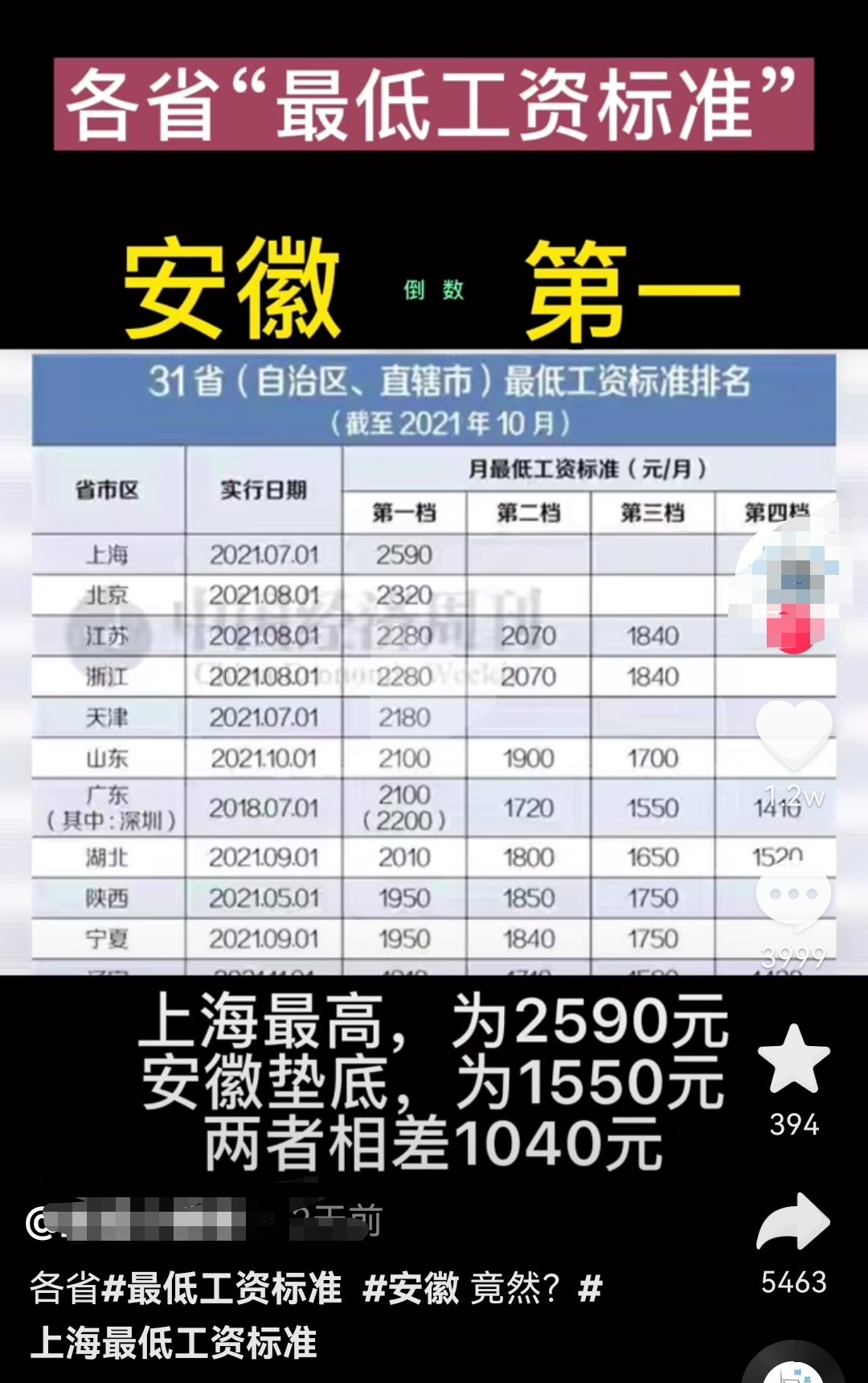 各省“最低工资标准”,安徽倒数第一?这真的假的啊?不敢相信,这么惨吗?