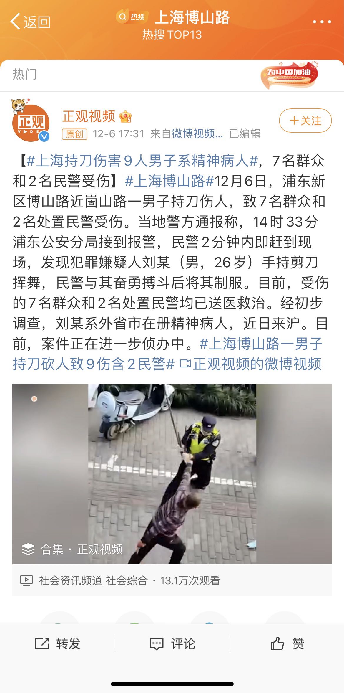 上海男子持刀伤人致7名群众和2名民警受伤,警方通报:系精神病人