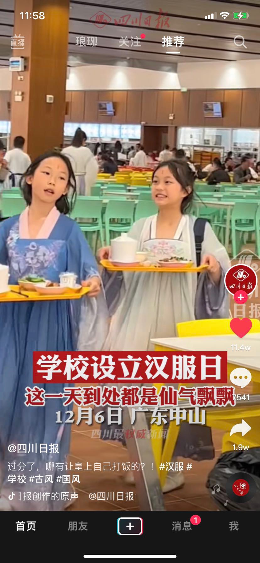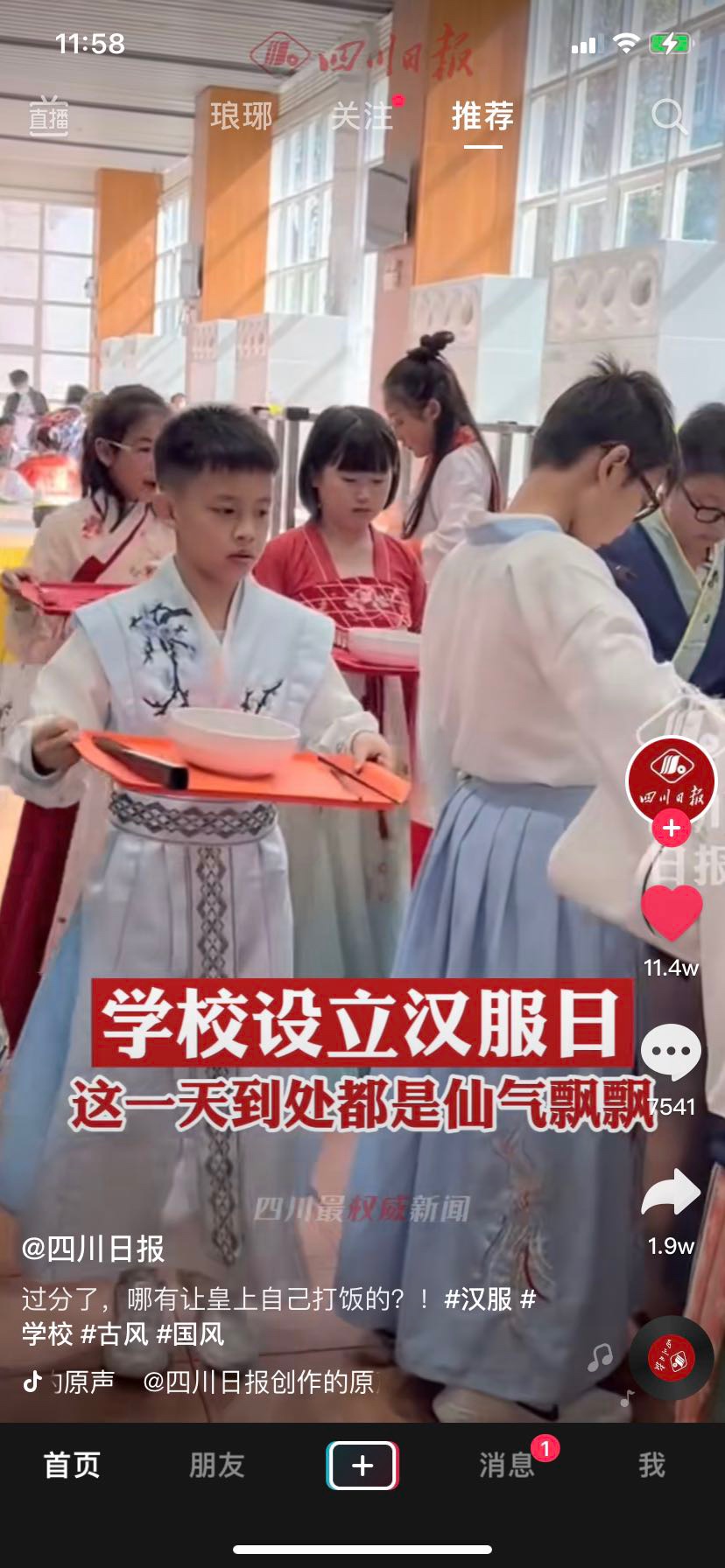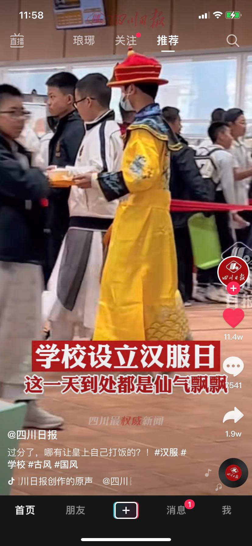 前两天刷抖音的时候看到有的学校开展汉服日,每一个学生都穿着汉服在学校里,包括老师主任在内。