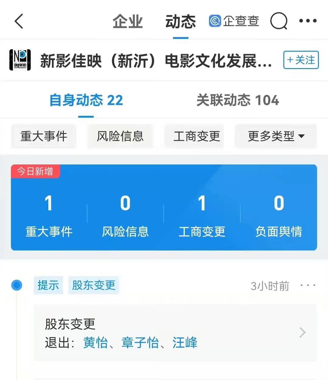 企查查App显示,近日,新影佳映(新沂)电影文化发展有限公司发生工商变更,汪峰、章子怡、海清(本名黄怡)退出该公司股东行列,退出前分别持股2.25%。目前,汪峰与章子怡关联公司仅剩一家。