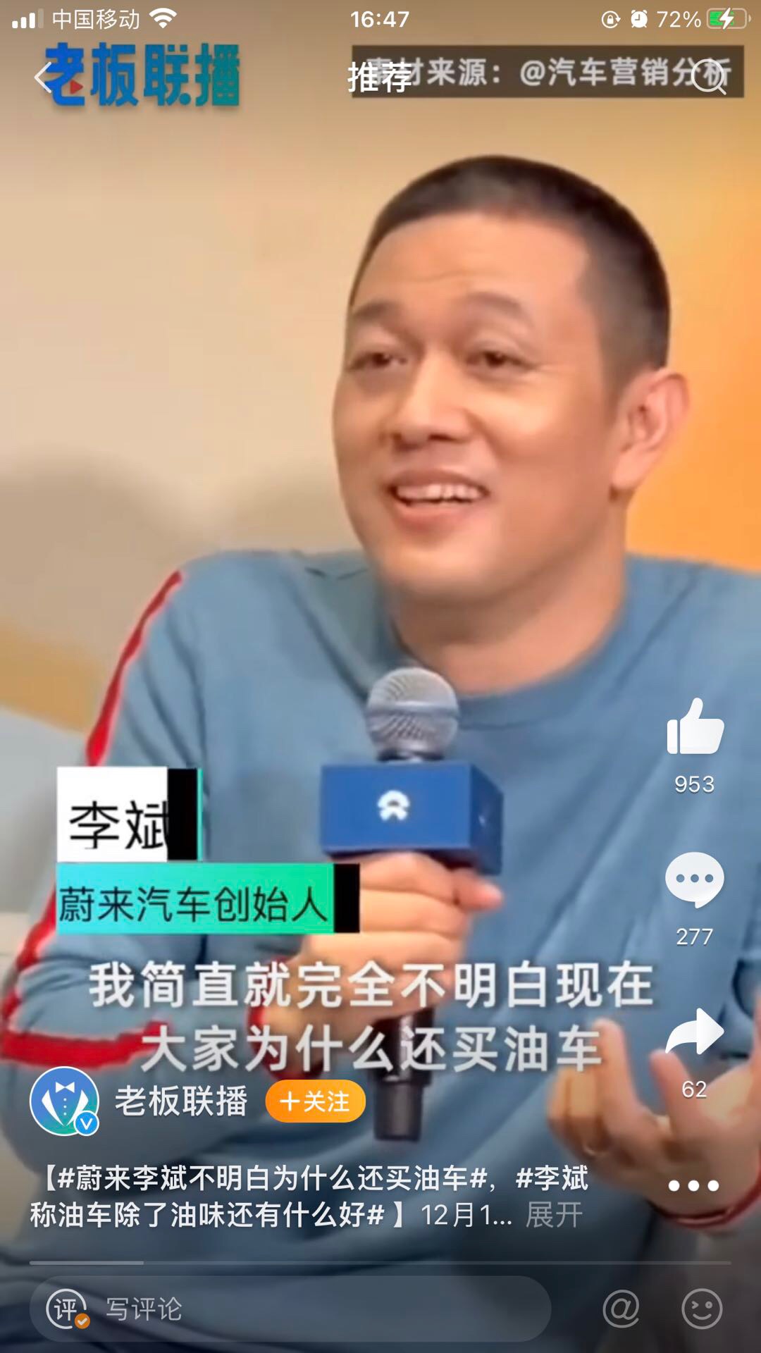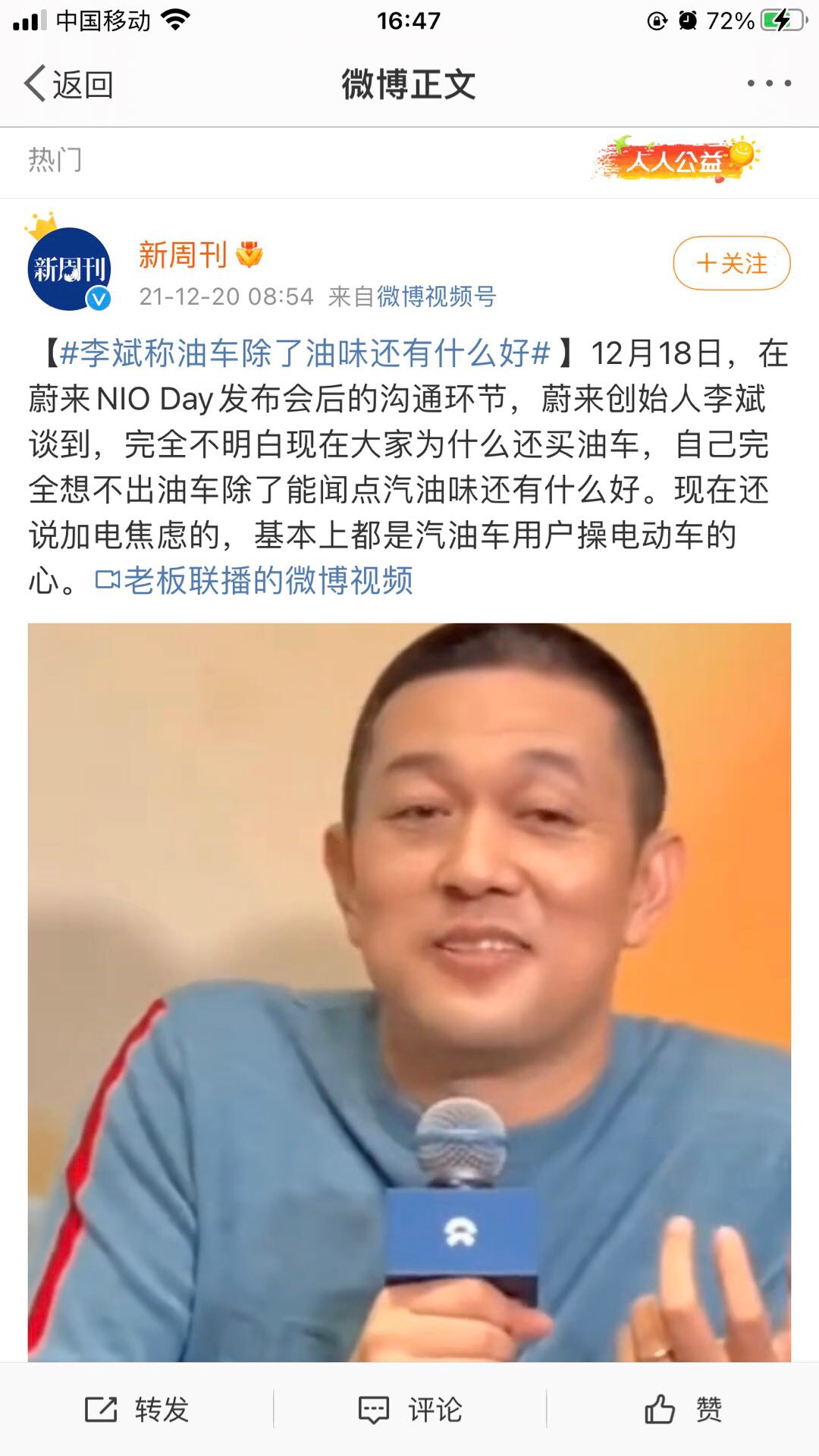 蔚来汽车创始人李斌近日表示:“我简直就完全不明白,为什么现在还有人在买油车,完全想不明白。一个人有多怀旧,才会买油车啊!油车现在除了能闻点汽油味,我实在想不出还有什么好。”