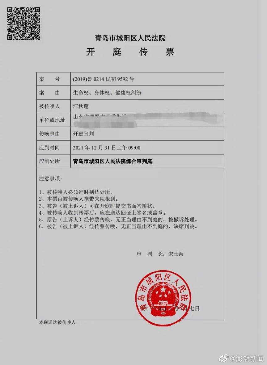 12月27日,澎湃新闻从江秋莲的代理律师黄乐平处获悉,江秋莲诉刘鑫生命权、身体权、健康权纠纷一案将于12月31日上午在青岛市城阳区人民法院开庭宣判。澎湃新闻此前报道,2016年11月3日凌晨,在日本东京住所门外,江歌被室友刘鑫的前男友陈世峰杀害,年仅24岁。有质疑者称,江歌的死与刘鑫有关。凶案发生时,刘鑫在住所内,未对江歌施以援手。