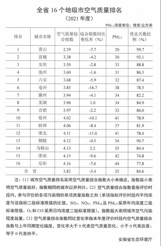 来源:安徽省生态环境厅 原标题:安徽16个地级市2021年度空气质量排名公布 黄山最优