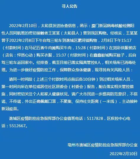 2022年2月10日,太和县发送协查信息,函示:厦门新冠病毒核酸检测阳性人员同航班的密切接触者王某某(太和县人)曾到我区购物。经核实,王某某曾于2022年2月8日下午自驾三轮车到谯城区淝河镇购物,2月8日下午15:17(付款时间)在马记五香牛肉摊购买牛肉,15:28(付款时间)在刘彩侠服装店(店名:怦然心动)购买衣服,15:37(付款时间)在鑫鑫鞋城购买鞋子,后自驾三轮车返回家中。经排查,截至目前已落实隔离管控8人,相关场所已消毒处理。