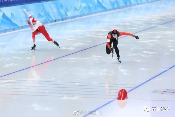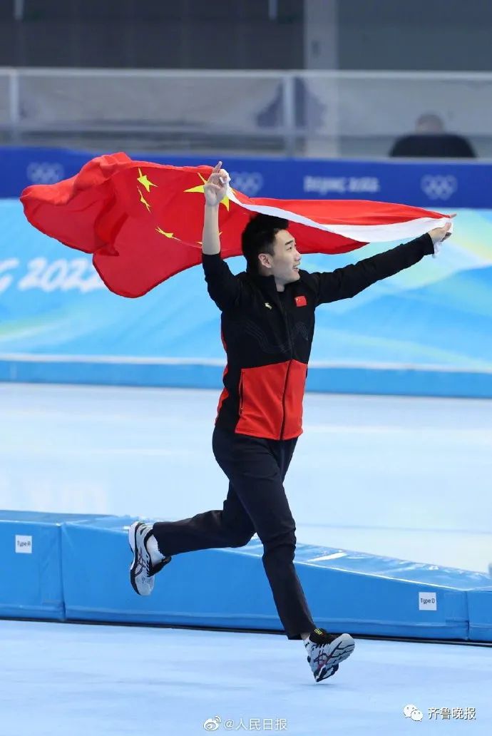 赛后,高亭宇高举国旗,绕着“冰丝带”内场奔跑,向观众致意,并发出怒吼,表达着夺金的激动之情。