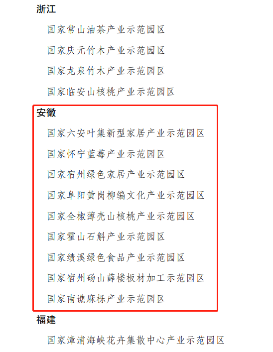 这9家园区分别是六安叶集新型家居产业示范园区、怀宁蓝莓产业示范园区、宿州绿色家居产业示范园区、阜阳黄岗柳编文化产业示范园区、全椒薄壳山核桃产业示范园区、霍山石斛产业示范园区、绩溪绿色食品产业示范园区、宿州砀山薛楼板材加工示范园区、南谯麻栎产业示范园区。