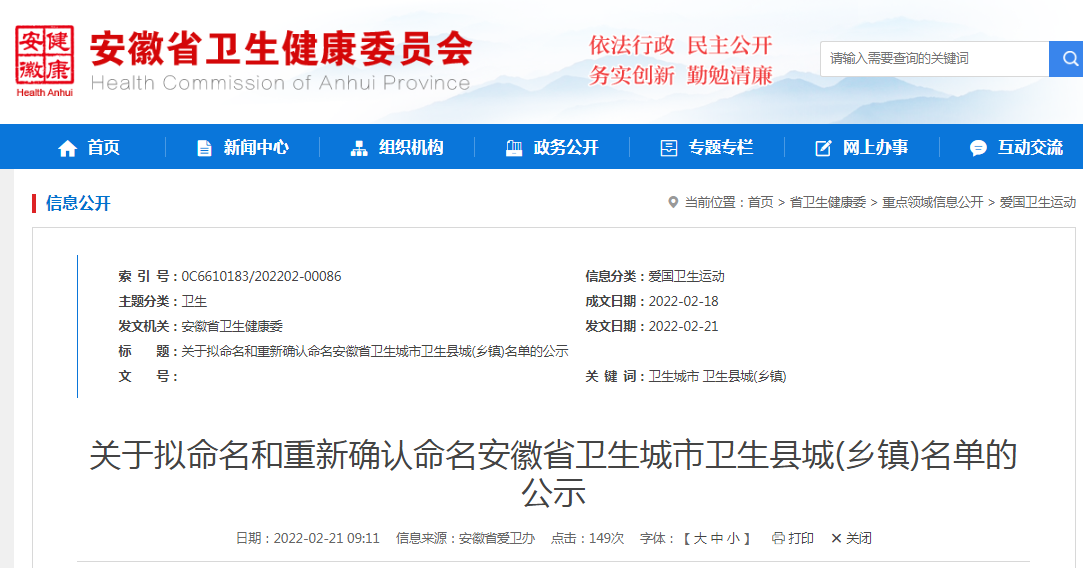近日,安徽省爱国卫生运动委员会办公室发布关于拟命名和重新确认命名安徽省卫生城市 卫生县城(乡镇)名单的公示。