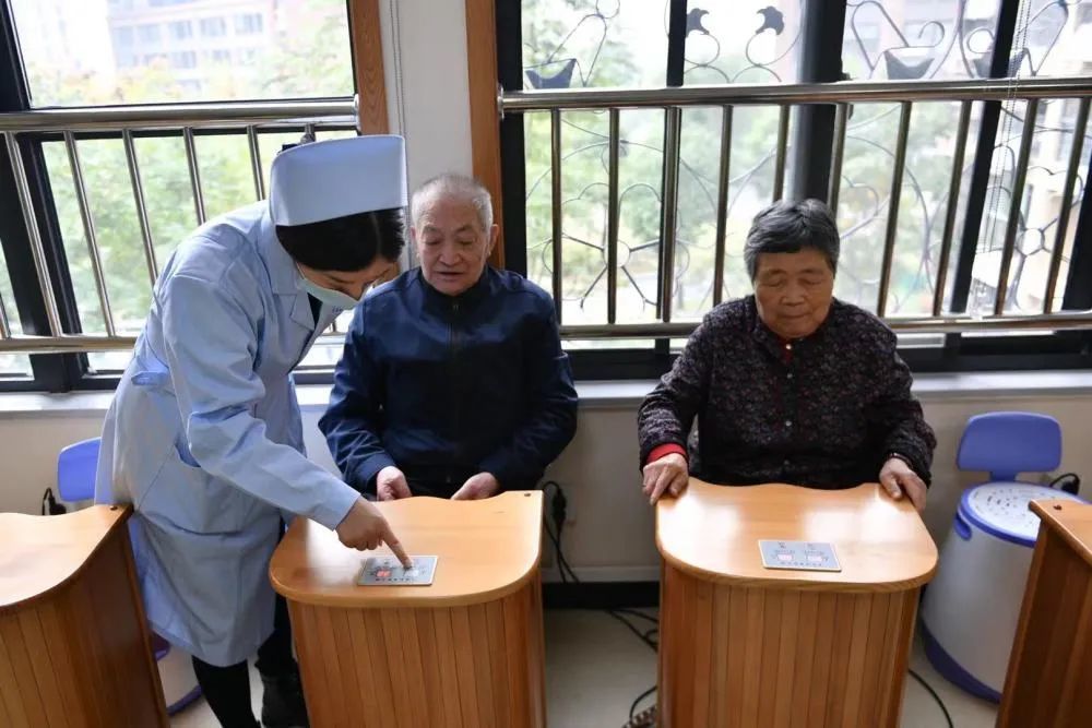 庐阳区四里河街道四河社区嵌入式养老服务中心乐年长者之家内,老人正在做远红外足膝养生舱理疗。