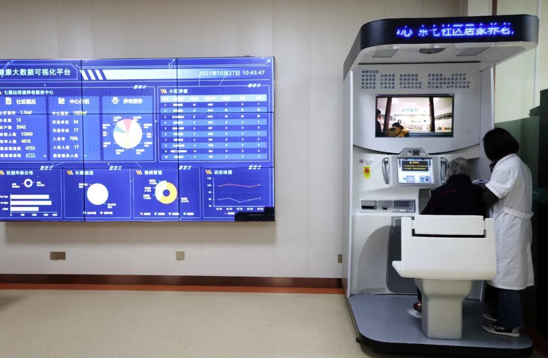 在瑶海区东七社区居家养老服务中心,医生在智能健康体检机上为老人进行身体健康检测。