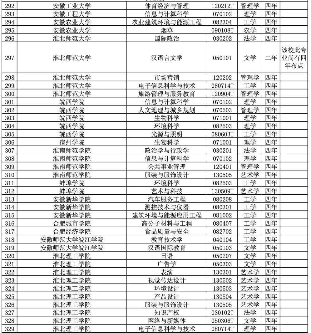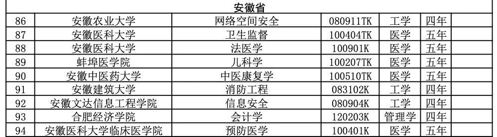 此外,在新发布的《新增审批本科专业名单》中,我省共有8所高校的9个专业“上榜”。其中包括,安徽农业大学的网络空间安全专业、安徽医科大学的卫生监督专业及法医学专业、蚌埠医学院的儿科学专业等。