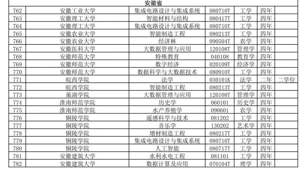 记者查询新公布的《新增备案本科专业名单》了解到,我省共17所高校的52个专业在列,且新增备案本科专业多为“人工智能”专业。其中,就包括合肥学院的集成电路设计与集成系统专业、合肥师范学院的集成电路设计与集成系统专业以及人工智能专业、合肥城市学院的人工智能专业、皖江工学院的人工智能专业。