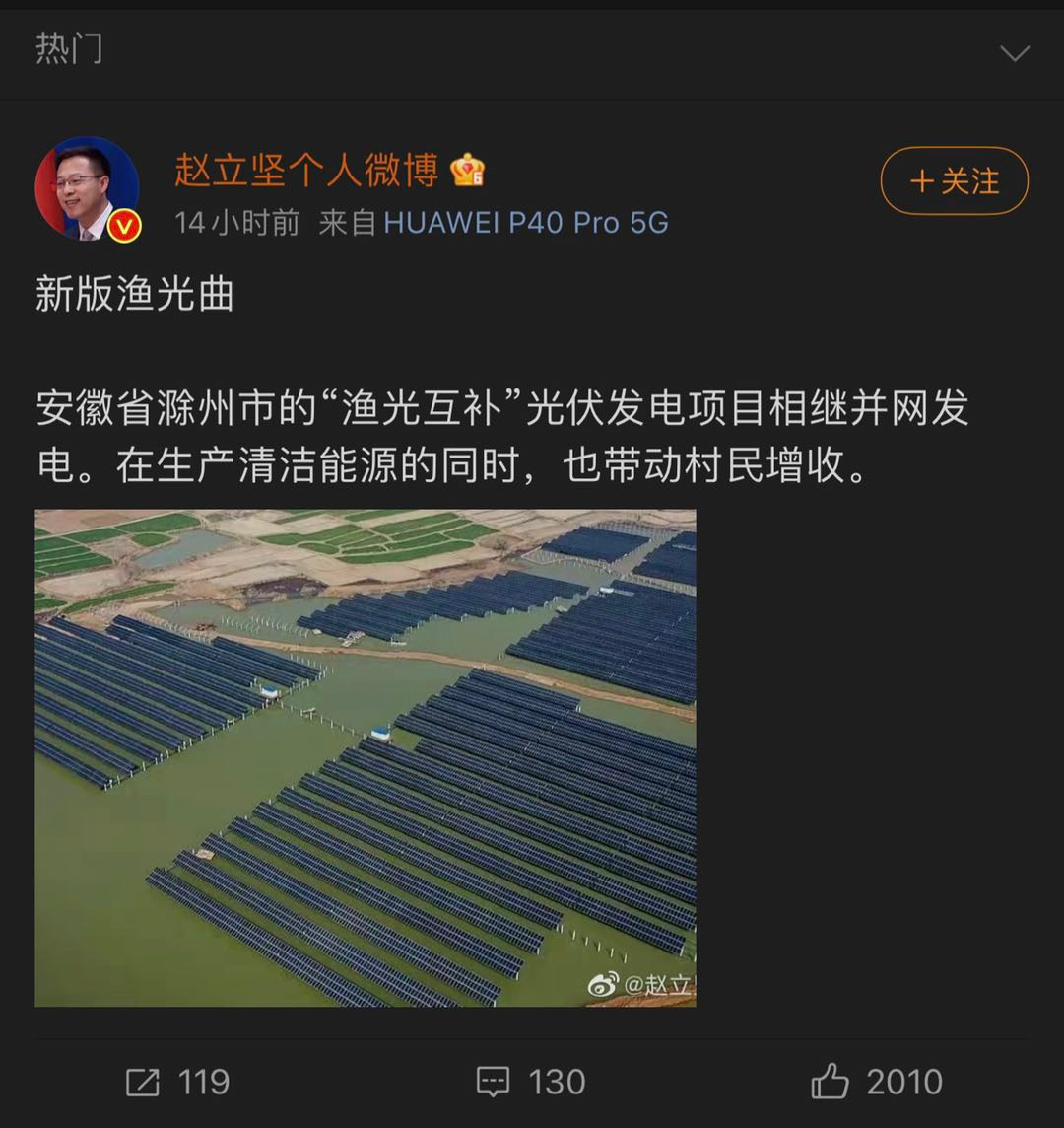 著名外交官赵立坚发微博称赞滁州!称赞滁州的“渔光互补”光伏发电项目
