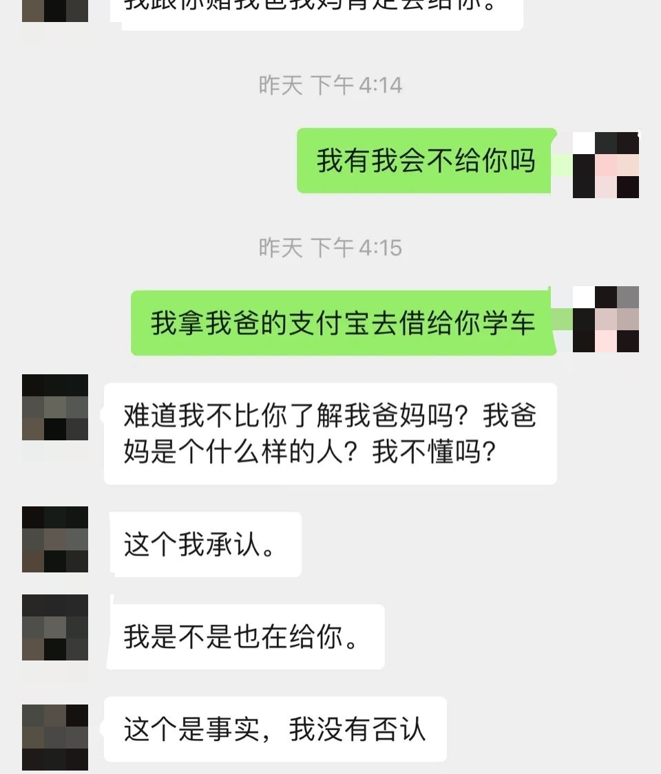 春节回家我给他刷了3000,分期3个月他每个月还一千。现在还没还完。4月中旬他要买车,看上的车大概14万,大概是首付7万左右,他爸给他出了4万,让他自己出3万他还缺1万问我借,没借给他,我是真没那么多钱,过了几天他又叫我去问父母借钱给他买车,我当时没和爸妈说,因为觉得问女朋友借可以,哪有让女朋友借父母给他买车的………这就有点离谱了。就因为我没借给他,也没问我父母借,现在就觉得我对他不上心