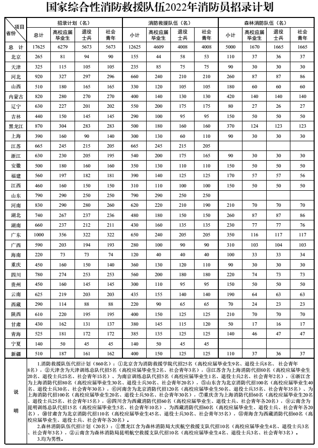 经应急管理部、人力资源社会保障部批准,此次国家综合性消防救援队伍共招录消防员17625名(均为男性),其中:高校应届毕业生6279名、退役士兵5673名、社会青年5673名。