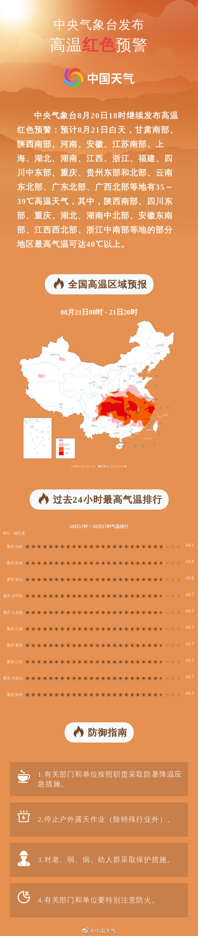 中央气象台8月20日18时继续发布高温红色预警:预计8月21日白天,甘肃南部、陕西南部、河南、安徽、江苏南部、上海、湖北、湖南、江西、浙江、福建、四川中东部、重庆、贵州东部和北部、云南东北部、广东北部、广西北部等地有35~39℃高温天气,其中,陕西南部、四川东部、重庆、湖北、湖南中北部、安徽东南部、江西西北部、浙江中南部等地的部分地区最高气温可达40℃以上。