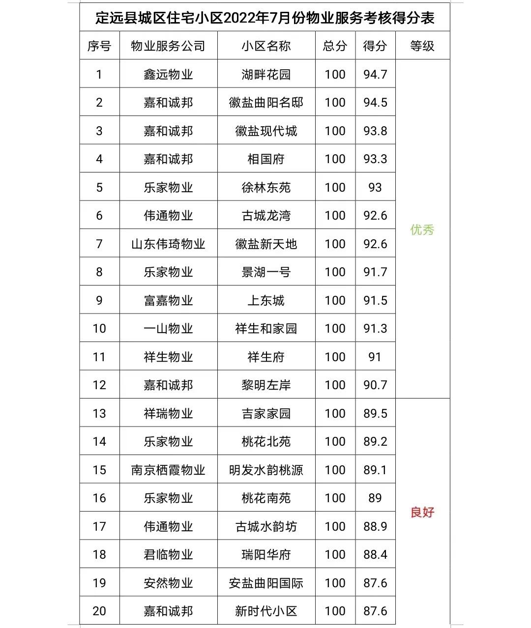 为进一步规范物业企业服务行为,提升物业服务水平,提高业主满意度,县物业管理工作领导小组办公室组织定城镇、经开区、县公安局、县城管执法局、县市场监督管理局、县消防大队、县城乡水务公司、县住建局,对全县92家住宅小区的物业管理情况进行7月份考核,现将考核情况通报如下: