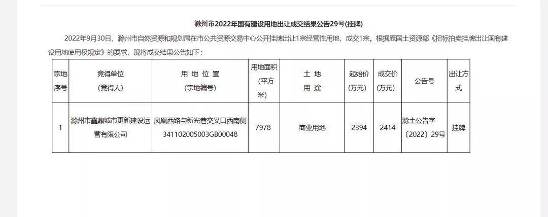 地块由滁州市鑫鼎城市更新建设运营有限公司摘得,通过相关平台查询,该公司为滁州市鑫城置业有限公司的子公司,地块成交楼面价2017元/㎡