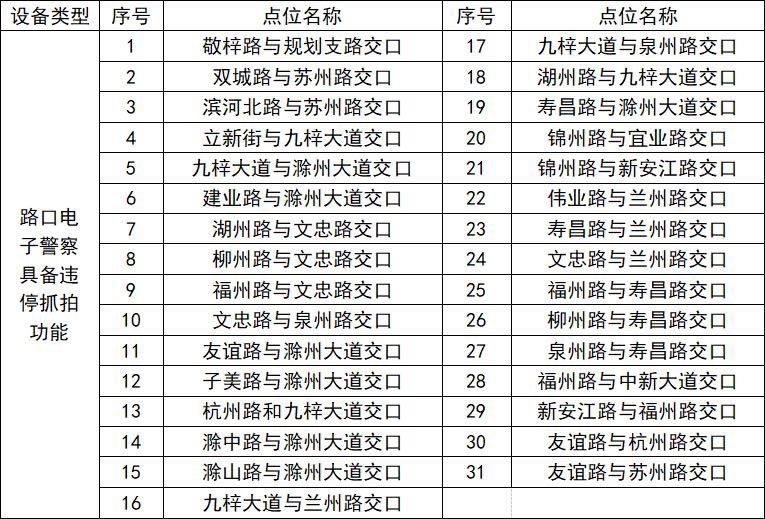 根据《中华人民共和国道路交通安全法》、《中华人民共和国道路交通安全实施条例》以及安徽省实施办法,为进一步提高交通参与者的交通安全意识,预防和减少道路交通事故,维护道路交通安全稳定,滁州市公安局交通巡逻警察支队拟定于2022年11月1日启用以下电子监控抓拍设备,现将设备类型和点位分布公示如下: