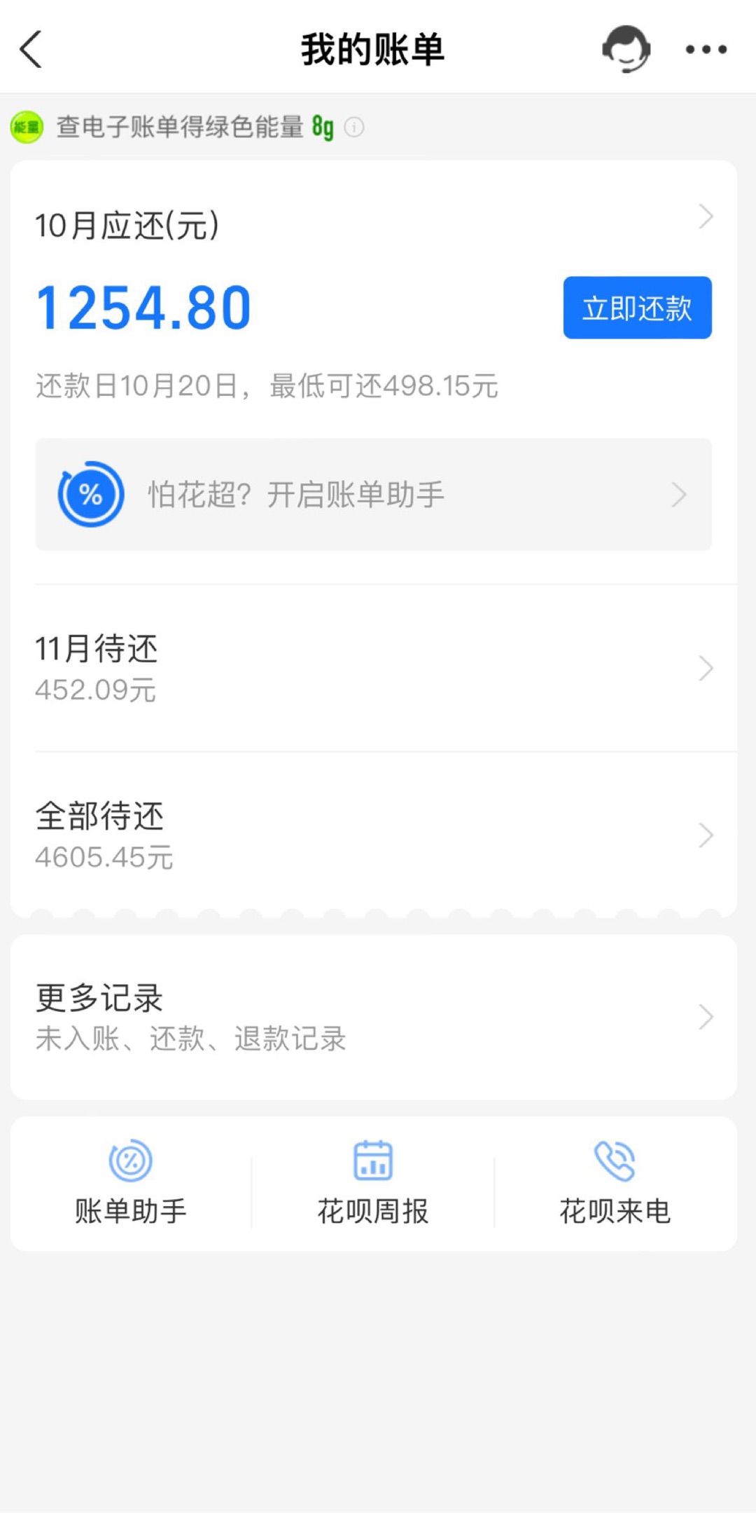 用花呗会上瘾啊!之前618搞活动买了手机,分期的,这才第四期,最近又赶上双十一,降温买衣服,好多地方花钱,10月份要还1254.80元,全部待还的4605.45元,一个月四千块钱的工资,每个月还要给家里交2000块钱,心累!啥时候才能还完,关闭花呗