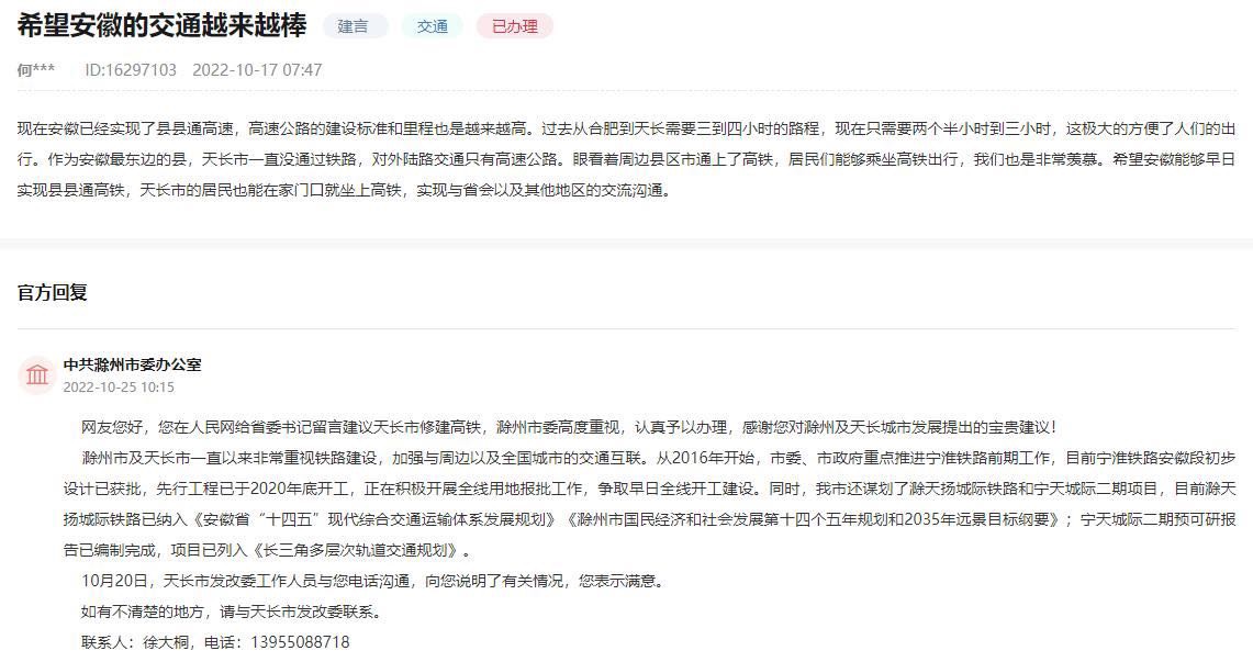 中共滁州市委办公室回复: 滁州市及天长市一直以来非常重视铁路建设,加强与周边以及全国城市的交通互联。从2016年开始,市委、市政府重点推进宁淮铁路前期工作,目前宁淮铁路安徽段初步设计已获批,先行工程已于2020年底开工,正在积极开展全线用地报批工作,争取早日全线开工建设。