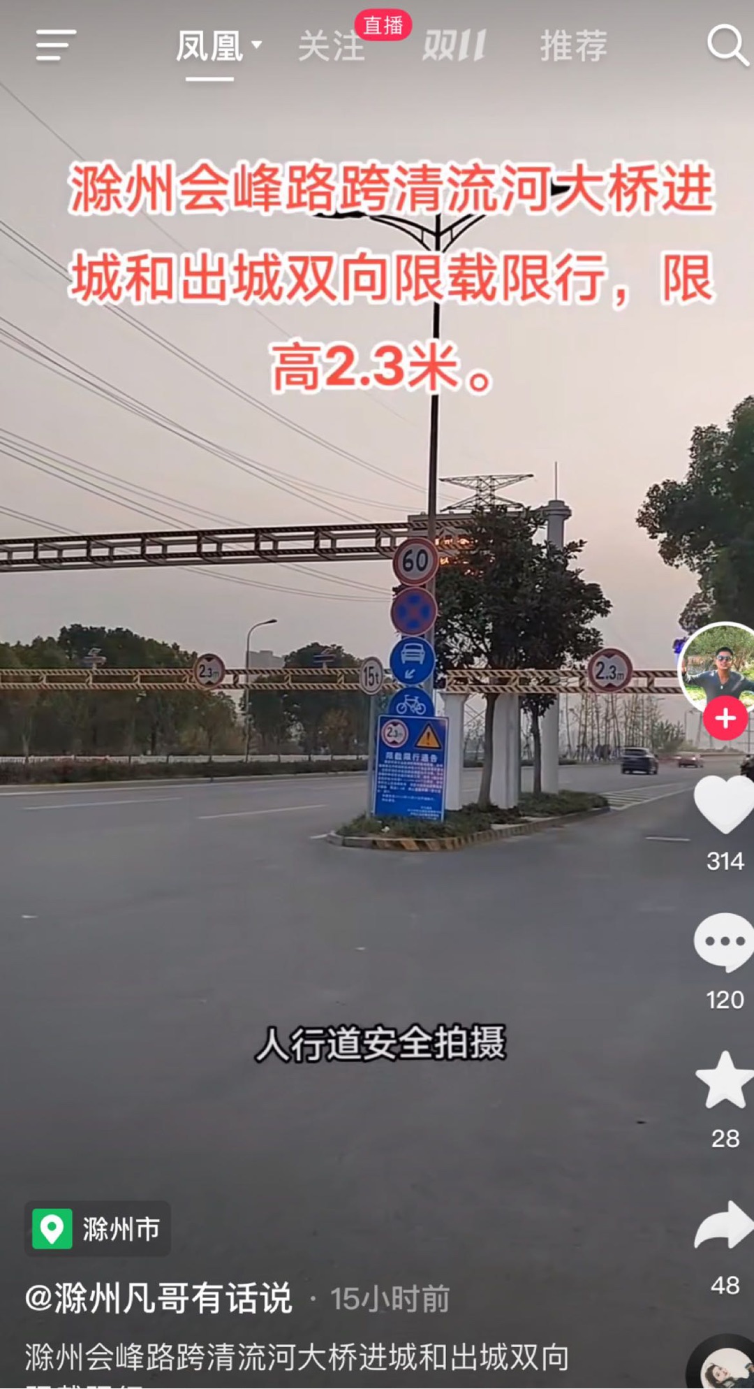 滁州人注意了,会峰路跨清流河大桥限载限行,限高2.3米,限高杆已经安装