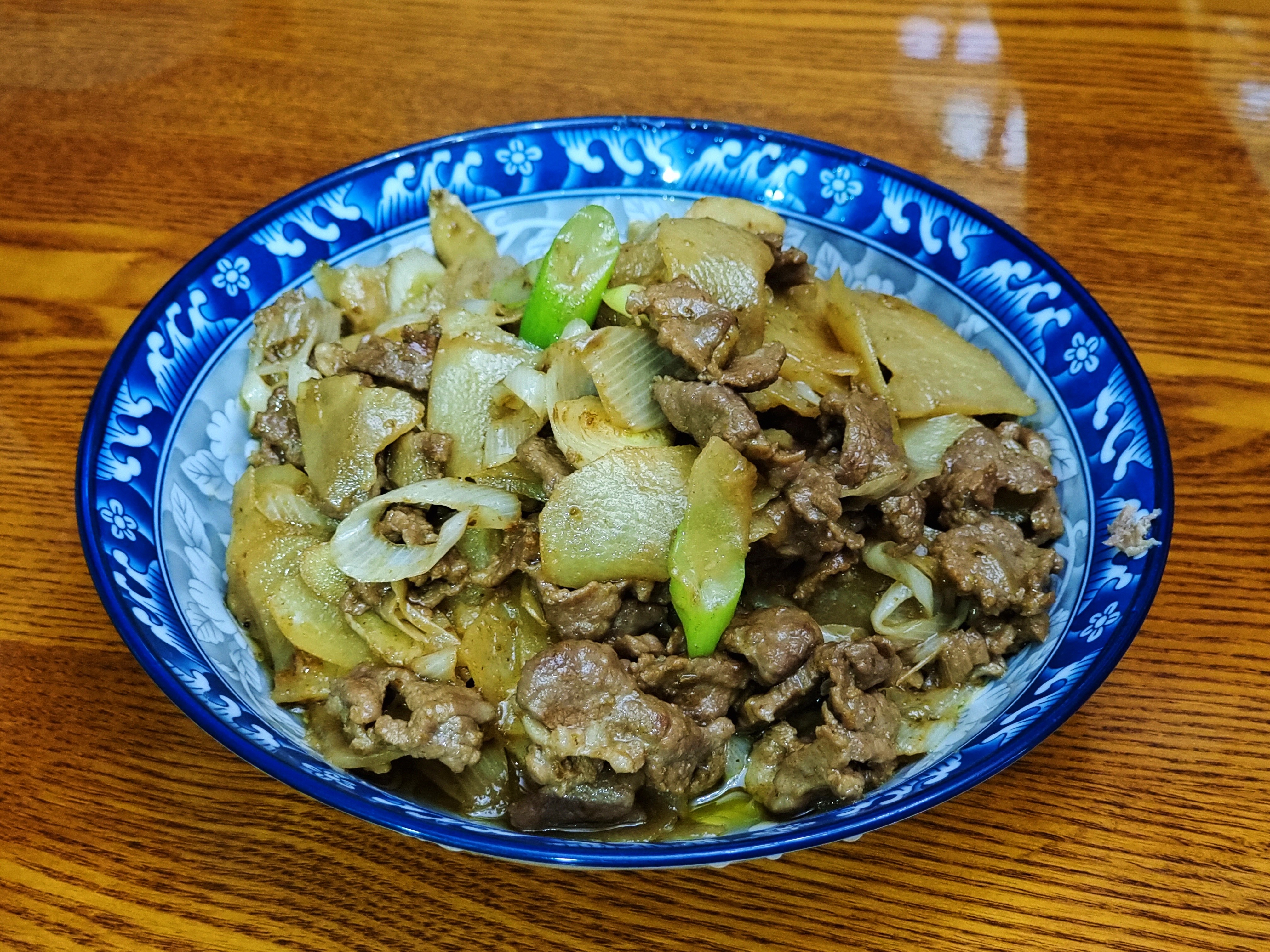 大葱土豆爆牛肉,只用油不加水,出锅前撒上孜然,完全的烧烤味儿