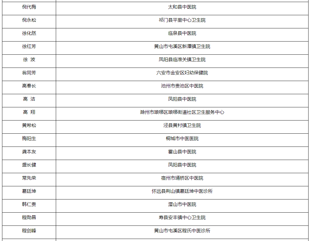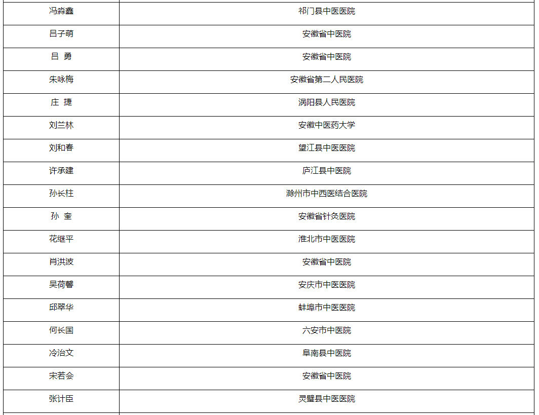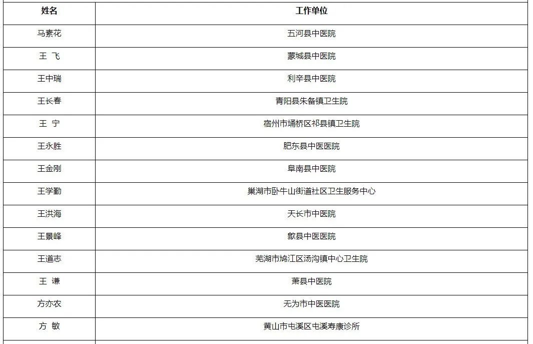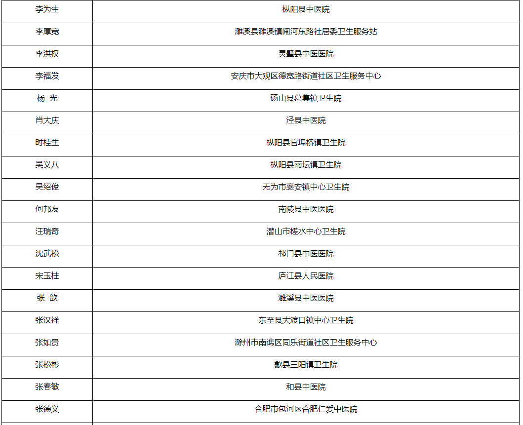 11月21日,省卫健委和省中医药管理局发布人选公示。其中,安徽省国医名师人选10人,安徽省名中医人选69人,安徽省名中药师人选10人,安徽省基层名中医人选97人。