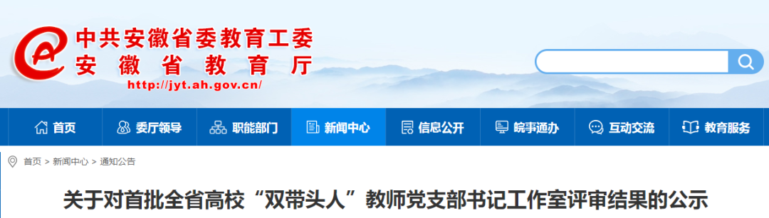 近日,省教育厅网站发布《关于对首批全省高校“双带头人”教师党支部书记工作室评审结果的公示》。